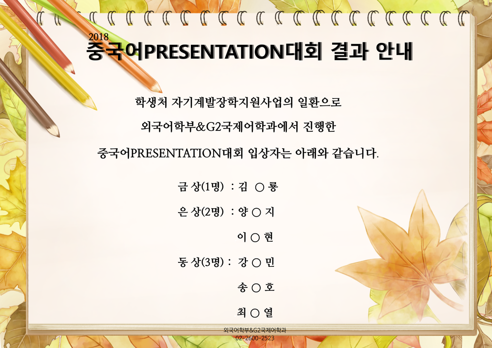 학생처 자기계발장학지원사업의 일환으로 외국어학부&G2국제어학과에서 진행한 중국어PRESENTATION대회 입상자는 아래와 같습니다