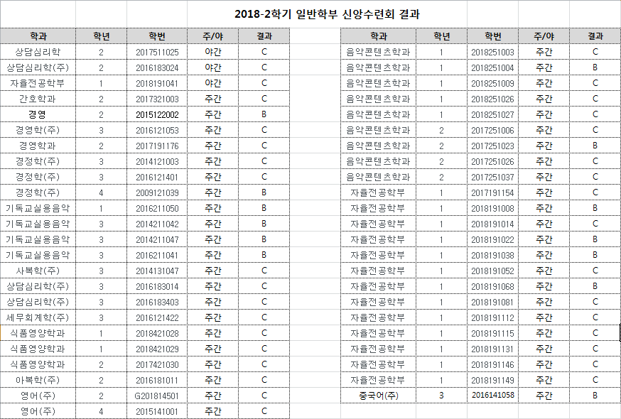 2) 신앙수련회 성적이 A,B,C에 해당하는 학생들은 학기말 보충세미나 대상자 입니다. 추후에 교목실에서 개별연락으로 공지합니다. 채플 성적에 따라 보충세미나 대상자에서 제외될 수 있으니 유의하시기 바랍니다. 기타 문의 사항은 교목실로 방문 바랍니다.