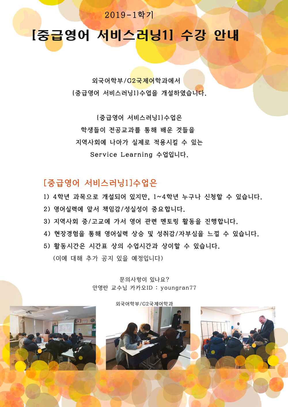 | 제목 | [외국어/G2국제어학과]2019-1학기 [중급영어 서비스러닝1] 수강 안내 | ||