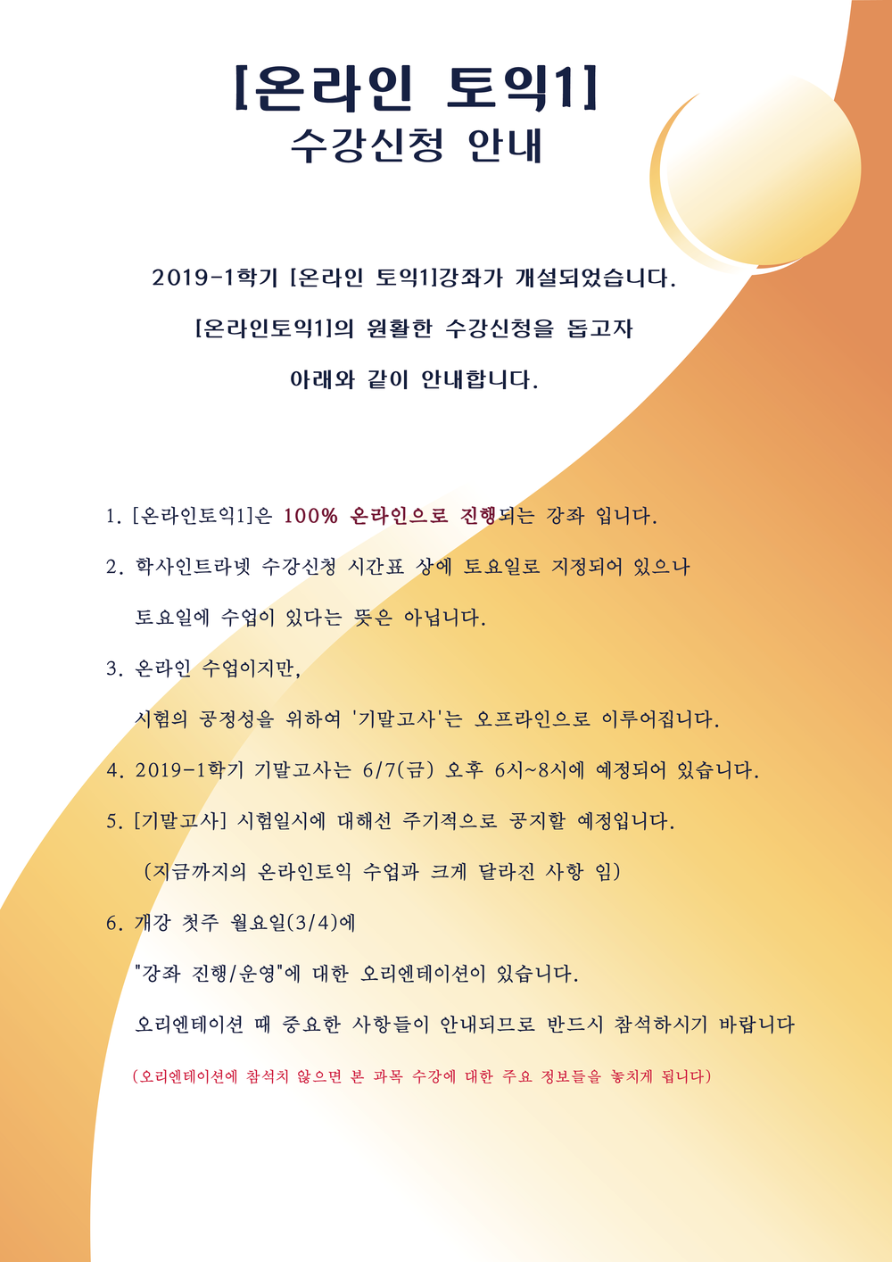 | 제목 | [교양교육원] 온라인토익1 수강신청 안내 | ||