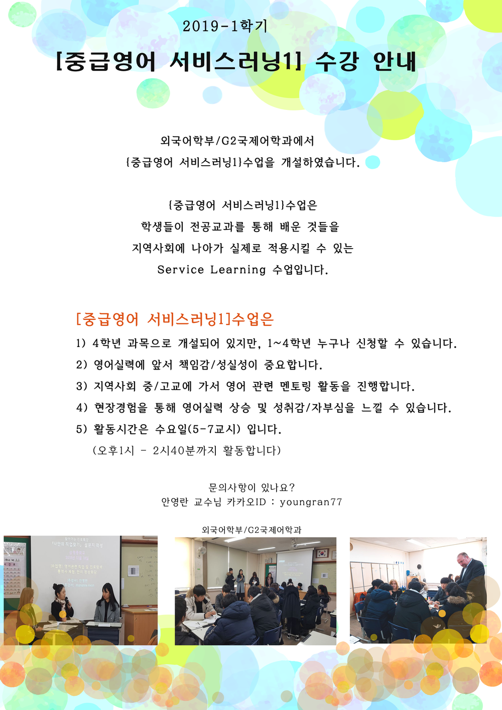| 제목 | [외국어/G2국제어학과]2019-1학기 [중급영어 서비스러닝1] 수강신청 2차안내 | ||