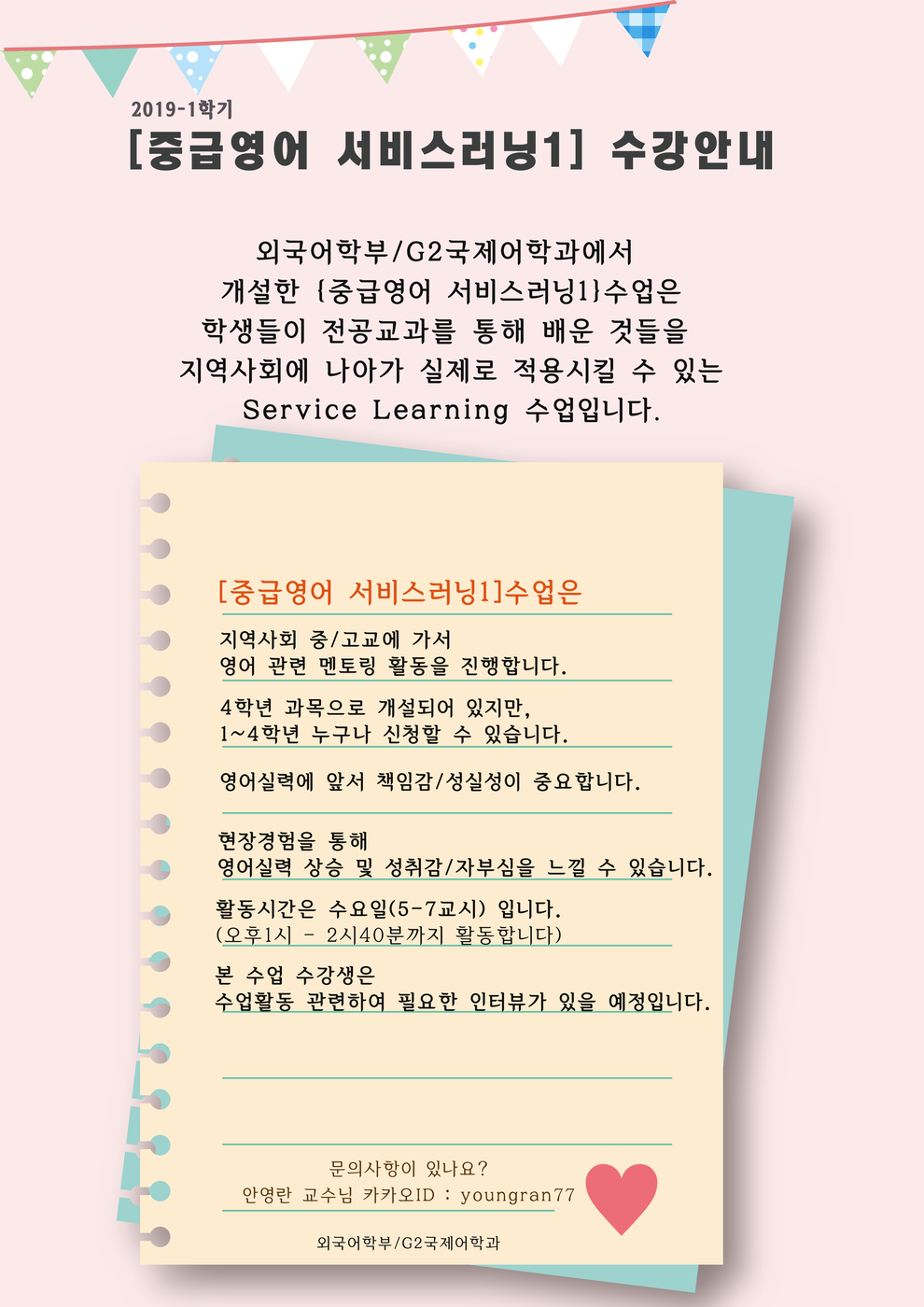 | 제목 | [외국어/G2국제어학과]2019-1학기 [중급영어 서비스러닝1] 수강신청 3차안내 | ||