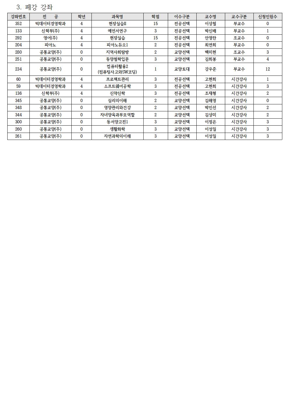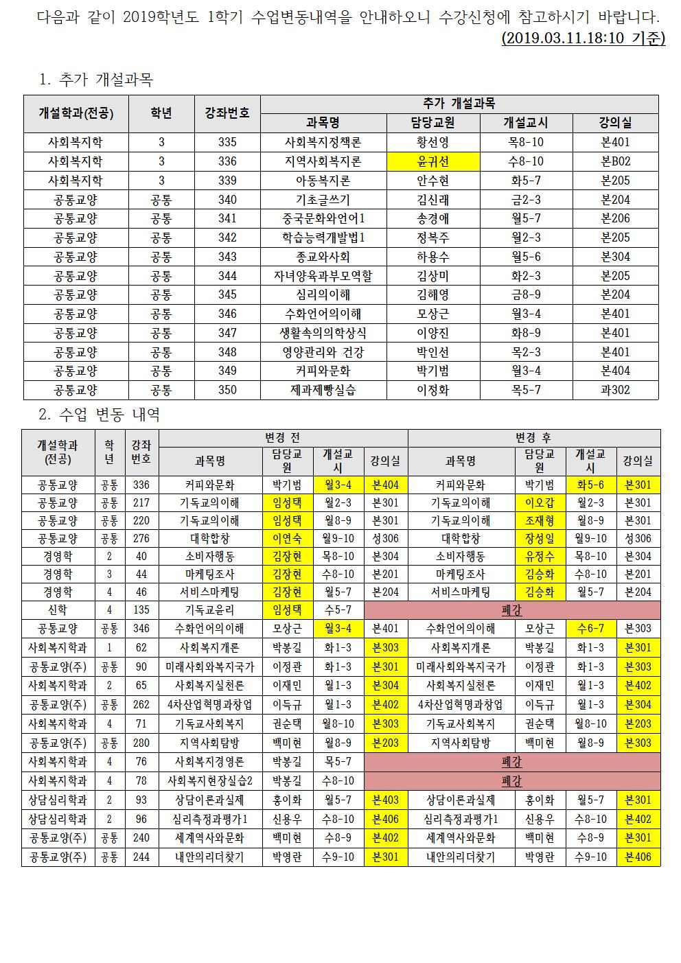 | 제목 | [교무처] 2019-1 수업변동 및 추가개설 내역 안내(190306) | ||