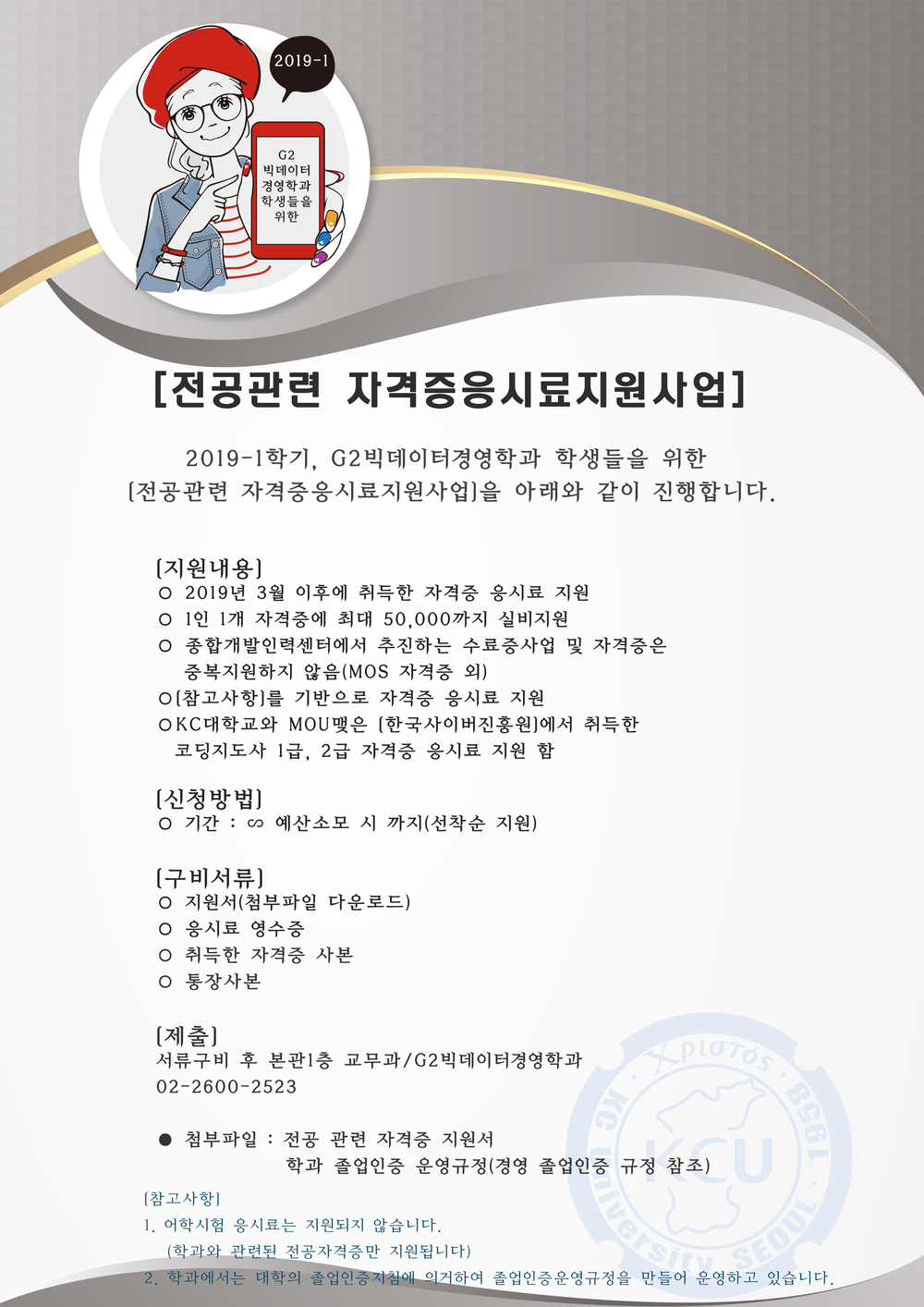 | 제목 | [G2빅데이터경영학과] 2019-1 전공관련 자격증응시료지원사업 안내 | ||