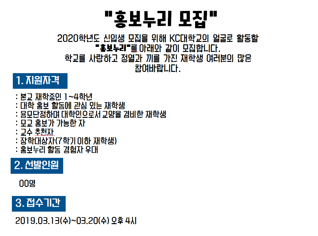 | 이전글 | [기획처] 2019 언론홍보단 모집 | 2019-03-13 |