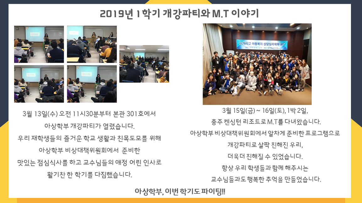 | 제목 | [아동복지상담심리학부] 2019년 1학기 개강파티와 M.T 이야기 | ||
