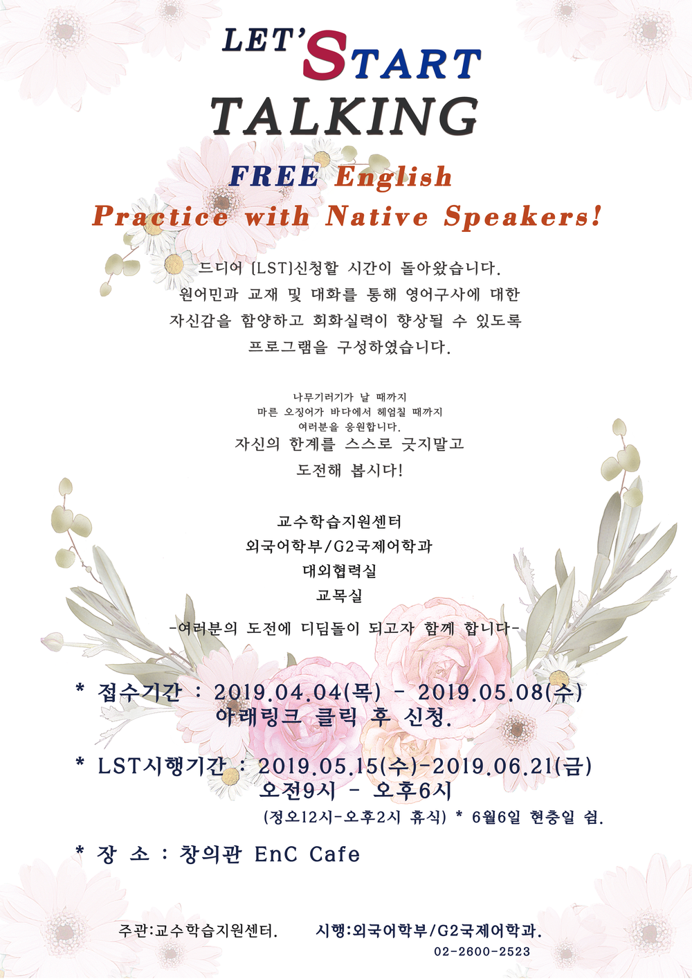 | 이전글 | ♥[교수학습지원센터] 2019학년도 프로그램 일정안내 | 2019-04-09 |