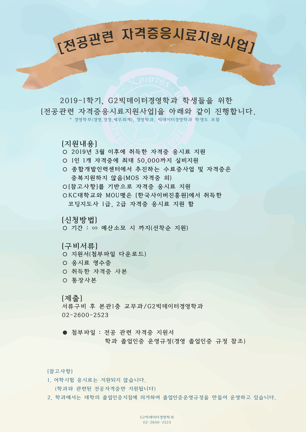 | 제목 | [G2빅데이터경영학과] 2019-1 전공관련 자격증응시료지원사업 안내 | ||