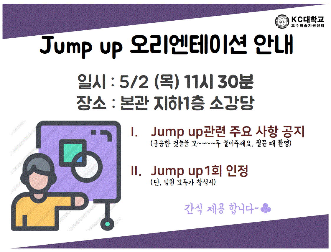 | 제목 | ♥[교수학습지원센터] 2019-1학기 jump up 오리엔테이션 안내 + 자주묻는 Q&A | ||