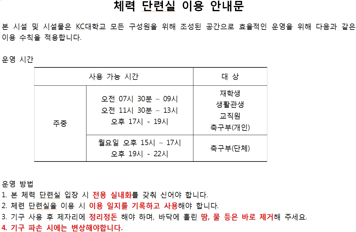 진리관(생활관) 지하 1층 체력 단련실 이용 안내문 KC대학교의 모든 공동체에 알립니다. 진리관 지하 1층에 체력 단련실을 만들었습니다. 이에 이용 안내문을 공지합니다. 잘 확인하시고 많은 이용 바랍니다. 이용 시에는 반드시 이용 수칙을 지켜주기를 간곡히 당부드립니다. 우리 모두의 재산입니다. 단, 진리관 1하 1층에 만들어졌기에 운영 시간만 진리관 1층 중간 출입문을 개방하겠습니다. 문의) 생활관 사감 김 범 수(2600 - 2428)