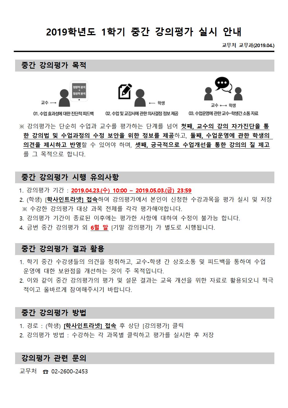 | 제목 | [교무처] 2019학년도 1학기 중간 강의평가 실시 안내 | ||