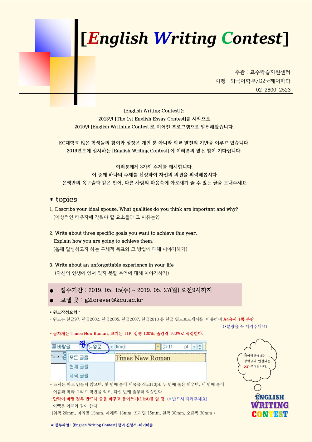 | 제목 | [교수학습지원센터] 2019-1 [English Writing Contest] 신청 안내 | ||