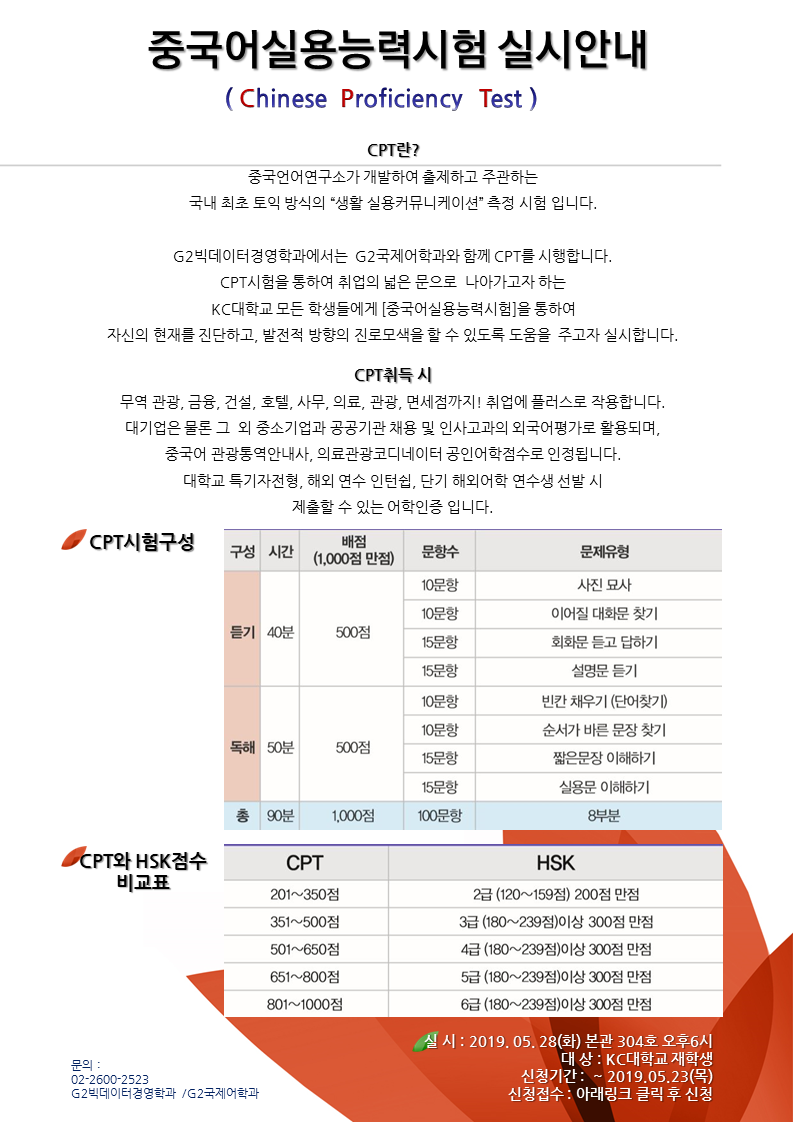 | 제목 | [G2빅데이터경영학과] 중국어실용능력시험(CPT) 실시 4차 안내 | ||