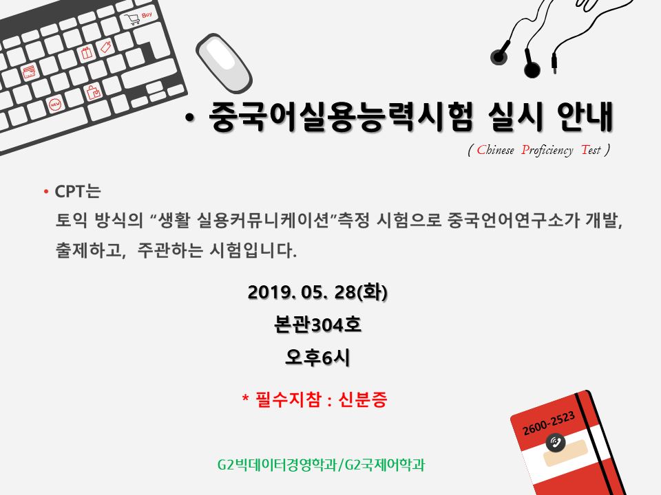 | 제목 | [G2빅데이터경영학과] 중국어실용능력시험(CPT) 실시 안내 | ||