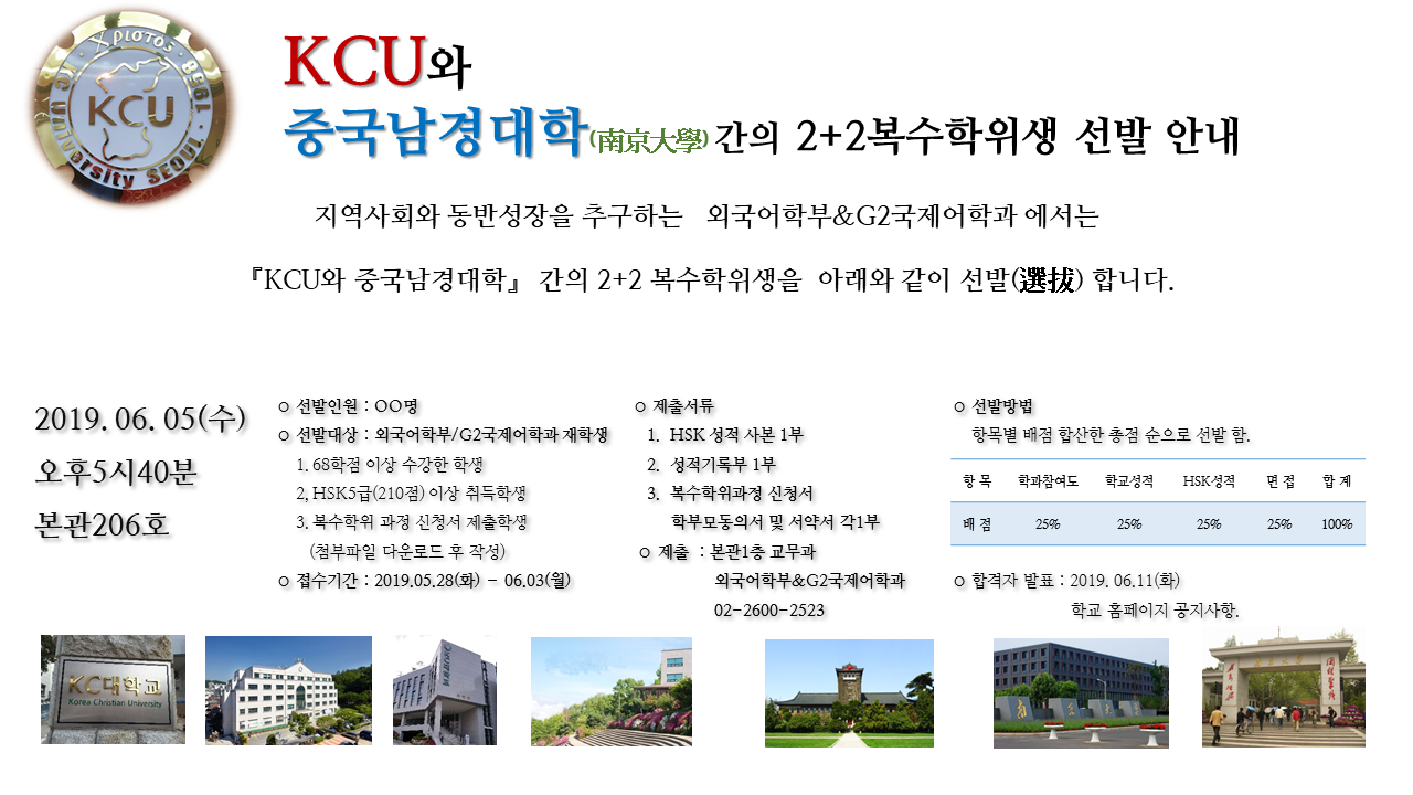 | 제목 | [외국어학부/G2국제어학과] KCU와 중국남경대학간의 2+2복수학위생 선발 안내 | ||