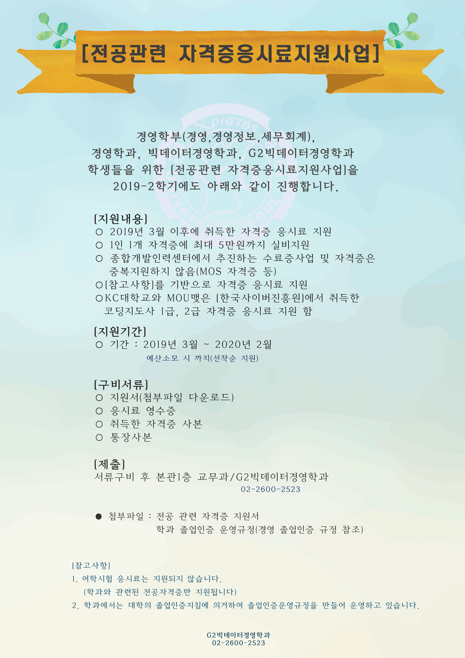 | 제목 | [G2빅데이터경영학과] 2019-2학기{전공관련 자격증응시료지원사업} 안내 | ||
