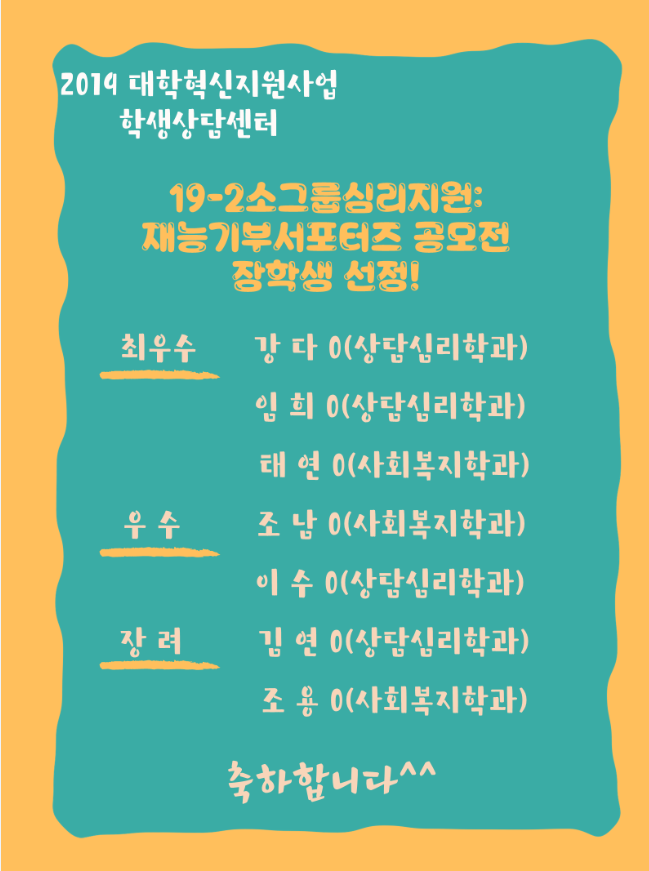| 제목 | [혁신][학생상담센터]19-2소그룹지원:재능기부서포터즈 공모전 장학생 선발 안내 | ||