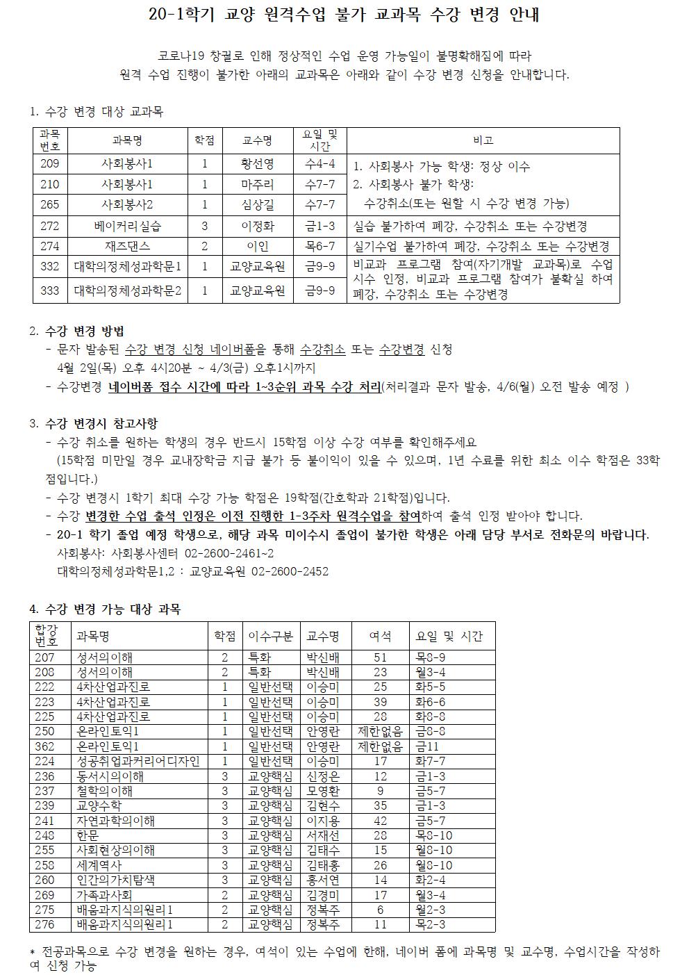 | 제목 | 20-1학기 교양 원격수업 불가 교과목 수강 변경 안내 | ||