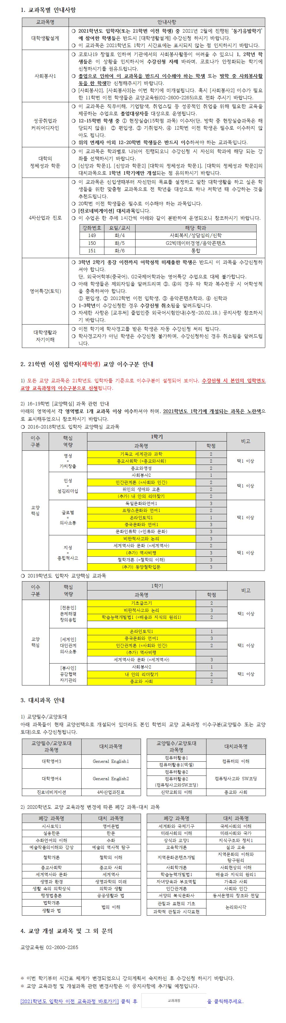 3. 대치과목 안내 1) 교양필수/교양토대