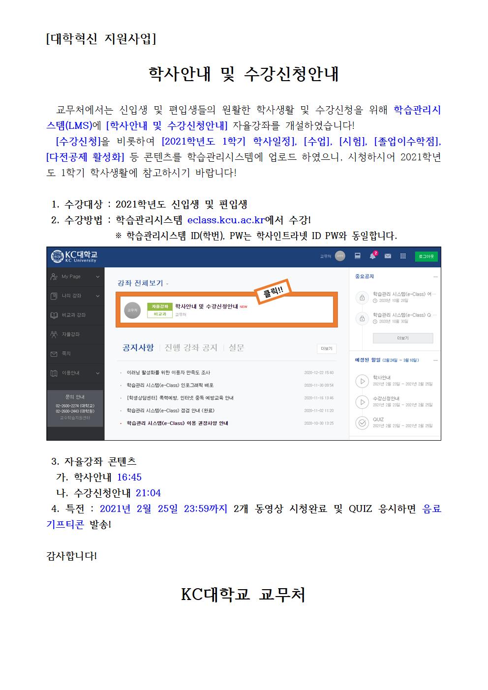 | 제목 | [혁신사업] 학사안내 및 수강신청안내 자율강좌 개설안내 | ||