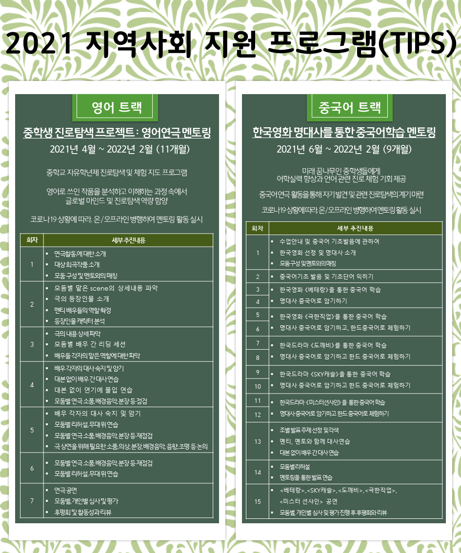 * 교수학습지원센터와 연계| 제목 | [G2국제어학과] 2021 지역사회 지원 프로그램(TIPS) 영어, 중국어 트랙 소개 | ||