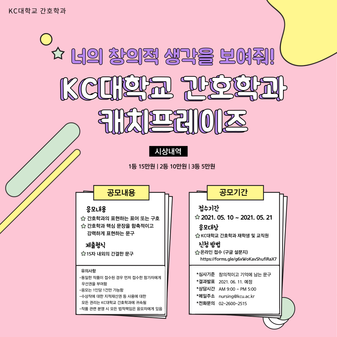 KC대학교 간호학과 학생 및 교직원 여러분들의 많은 관심과 참여 그리고 매력적인 아이디어를 구합니다!