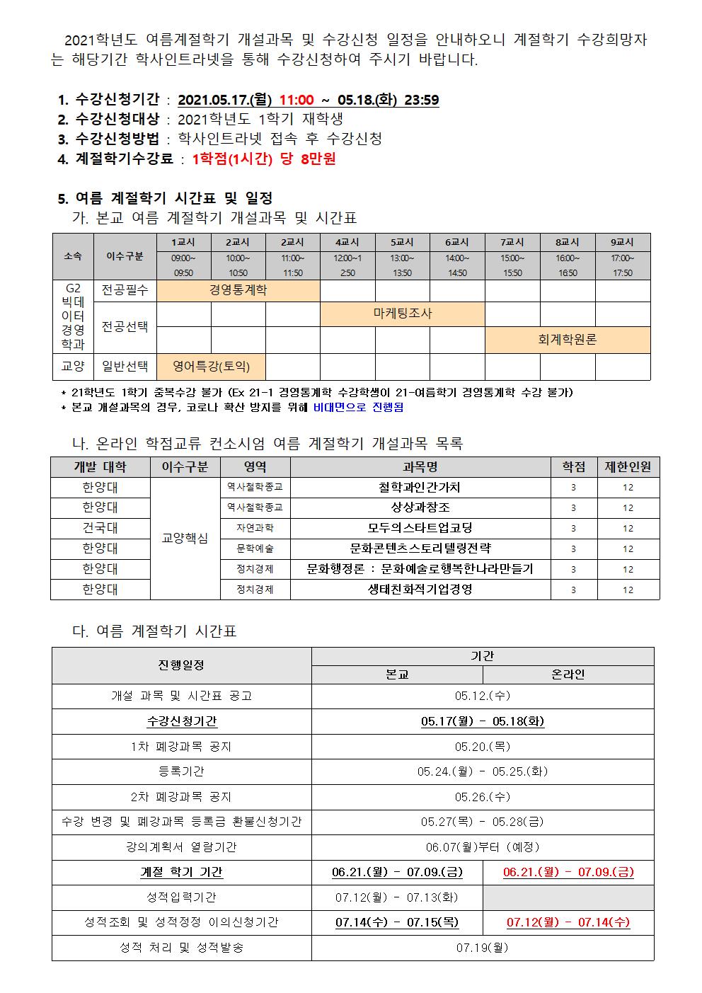 | 제목 | [교무처]2021학년도 여름계절학기 개설과목 및 수강신청 일정 안내 | ||