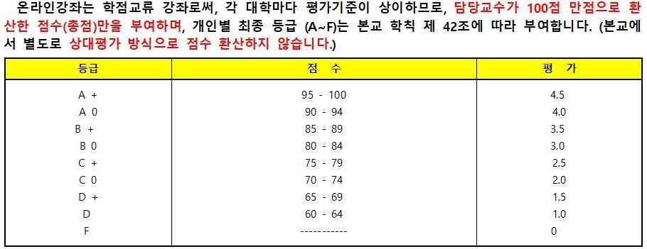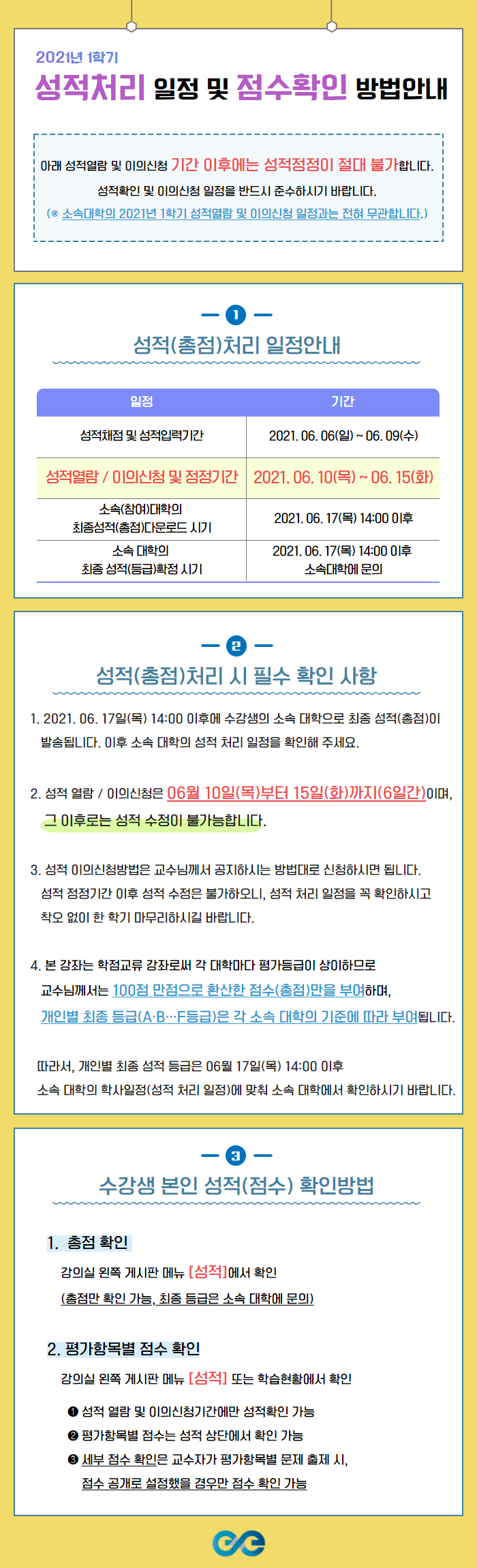 | 제목 | [교무처] 2021학년도 1학기 학점인정 컨소시엄 온라인강좌 성적확인방법 및 일정안내 | ||