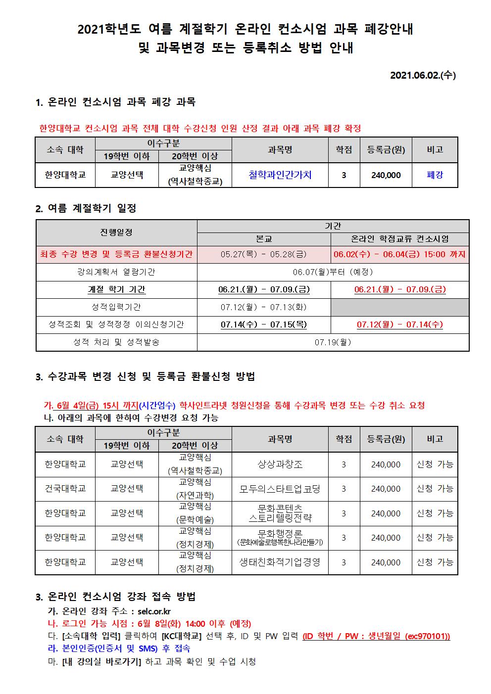 | 제목 | 여름 계절학기 온라인 컨소시엄 과목 폐강안내 및 과목변경 또는 등록취소 방법 안내 | ||