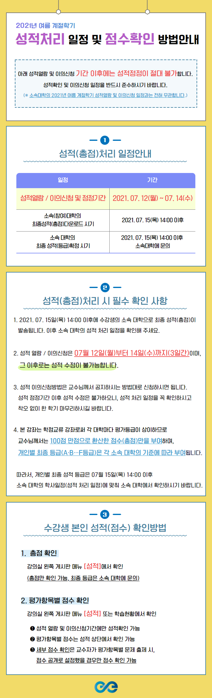 | 제목 | [교무처] 2021학년도 여름계절학기 온라인 컨소시엄 과목 성적 처리 일정 안내 | ||