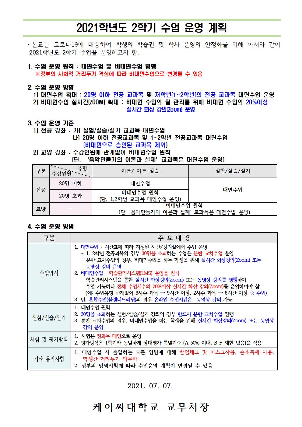 [교무처] 2021학년도 2학기 수업 운영 계획