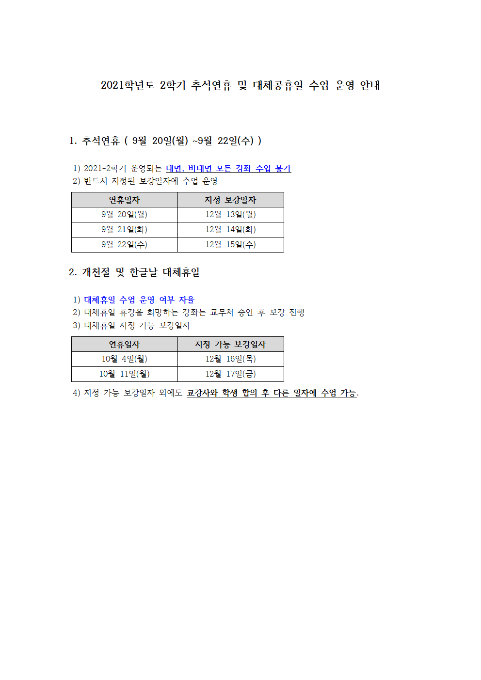 [교무처]2021학년도 2학기 추석연휴 및 대체공휴일 수업 운영 안내