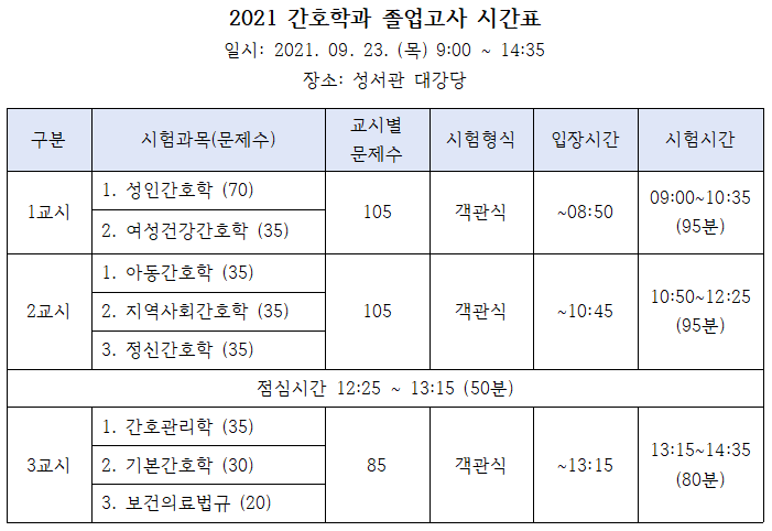 게시물 상세보기 - 제목, 등록일, 조회, 작성자, 내용으로 구성 제목 [간호학과] 2022년 2월 졸업예정자 졸업고사 공지사항 등록일 2021-09-16 조회 2474 작성자 간호학과