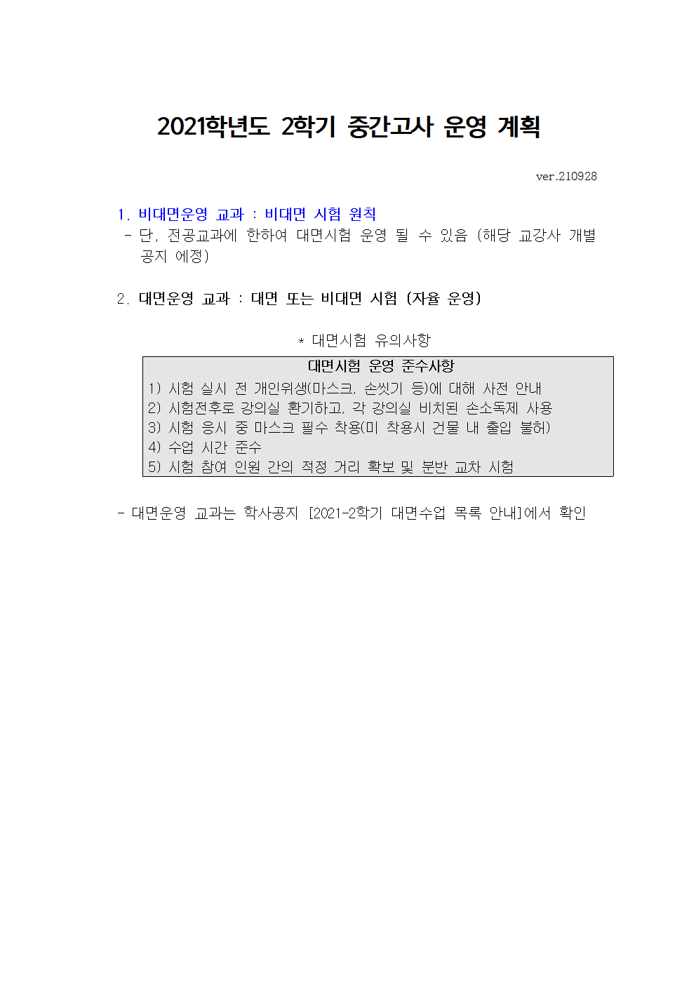 | 제목 | [교무처] 2021학년도 2학기 중간고사 운영 계획 | ||