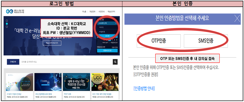 | 2021학년도 겨울계절학기 온라인 학점교류 컨소시엄 수강 안내 온라인 학점교류 컨소시엄 수강 관련 내용을 아래와 같이 안내하오니, 수강신청할 학생께서는 수업진행에 참고하시기 바랍니다. 1) 접속방법 * 접속 가능 시점은 12월 13(월) 예정 가) 온라인 강좌 주소 : selc.or.kr 나) [소속대학 입력] 클릭하여 [KC대학교] 선택 후, ID 및 PW 입력 (ID 학번 / PW : 생년월일 (ex:970101)) 다) 본인인증(인증서 및 SMS) 후 접속 라) [내 강의실 바로가기] 하고 과목 확인 및 수업 시청