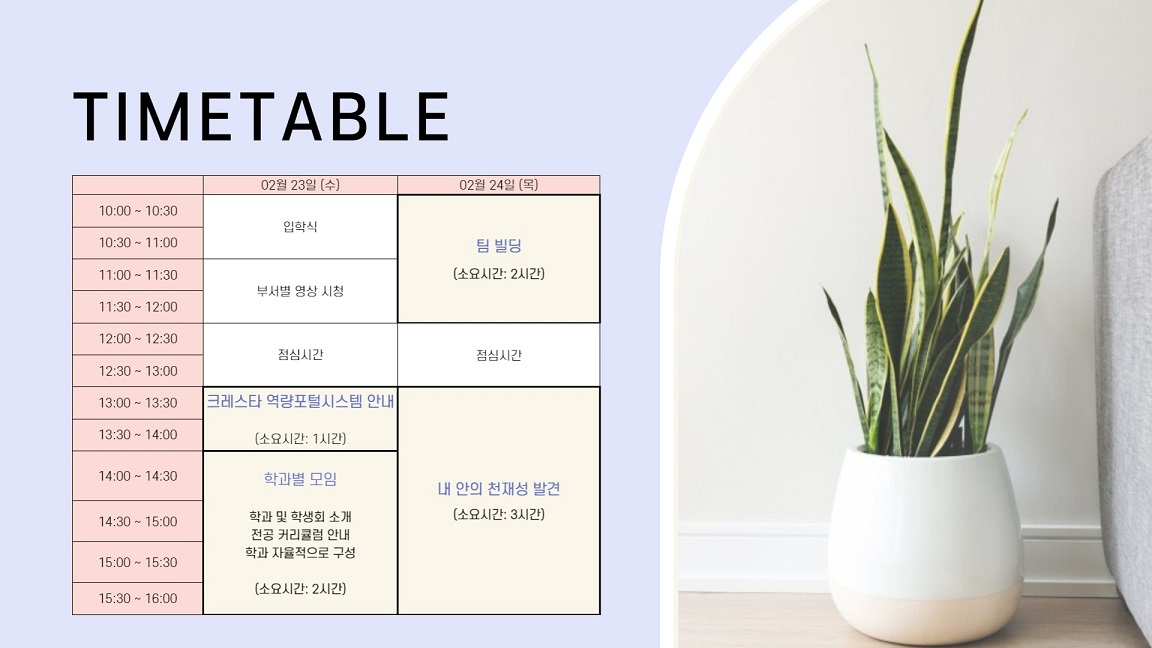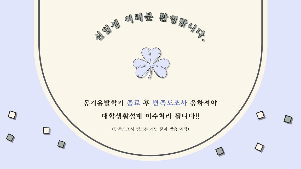 2023 동기유발학기 HELLO. 2023. 동기유발학기 참여 안내(교과목명 : 대학생활설계) 인사말 2023학년도 신입생 여러분 안녕하세요. 동기유발학기는 신입생의 대학생활 적응을 위해 필요한 정보전달뿐만 아니라 동기 간의 친밀감을 쌓고 원활한 대인관계를 도모하기 위해 진행되는 프로그램으로 전면 대면으로 진행됩니다. 자세한 내용은 아래를 참조해주시기 바라며, 문의사항은 언제든지 교양교육원(02-2600-2266)으로 연락주시기 바랍니다. 동기유발학기 개요 1. 일시 : 2023.02.22.(수) 입학식 직후 ~ 오후5시까지 2. 장소 : 하딩관(성서관) 3층 대강당 및 각 학과별 지정장소 3. 대상 : 2023학년도 신입생 전체 및 대학생활설계 미이수 재학생 ※ 모든 프로그램의 출석 처리가 되어야 이수 처리됩니다. (입학식 제외) ※ '대학생활설계'과목의 수청신청은 교양교육원에서 일괄신청 (개인 수강 신청 안됨) 4. 이수처리될 교과목 : 대학생활설계 (교양필수(교책), 0학점, P/F) 5. 타임테이블 : 아래 참조 6. 문의 : 교양교육원 (02-2600-2266) ※ 프로그램 종료 후 문자로 전송되는 만족도조사에 반드시 응해주셔야 합니다. 타임테이블 02월 22일 (수) 시간 : 10:00 ~ 11:30 내용 : 입학식(교무과) 장소 : 하딩관(성서관) 3층 대강당 시간 : 11:30~13:00 (1시간30분) 내용 : <동기유발학기> ① 점심시간 및 캠퍼스투어 (100명씩 나누어 3타임 진행 with 새도미장학생)- 11:30~ 1부(간호/신학/실용음악) - 11:50~ 2부(사회복지/상담심리) - 12:10~ 3부(식품영양/G2빅데이터경영) 장소 : 학교식당/교내 캠퍼스 시간 : 13:00~14:50(1시간50분) 내용 : <동기유발학기> ② 행정 OT- 13:00~13:30 학사제도 및 수강신청 안내(교무과) - 13:30~13:40 교양 이수체계 설명(교양교육원) - 13:40~13:50 학생 장학금 및 복지 소개(학생과) - 13:50~14:00 국제교류 프로그램 소개(대외협력실) - 14:00~14:20 크레스타포털(SGP) 소개(교육혁신원) - 14:20~14:30 취창업지원센터 프로그램 소개(취창업지원센터) - 14:30~14:40 교수학습센터 프로그램 소개(교수학습센터) 장소 : 하딩관(성서관) 3층 대강당 시간 : 14:50~15:00 (10분) 내용 : 이동시간 시간 : 15:00~17:00(2시간) 내용 : <동기유발학기> ③ 학과별 모임소속 학과(학부)별 소개 및 교과과정 안내 등 - 각 학과(학부) 및 학과장, 교수진, 학생회 소개 - 학과(학부) 교과과정 및 진로 안내 - 신입생과의 대화 및 질의응답 시간 등 장소 : 학과별 지정된 강의실 점심시간 안내 1부(간호/신학/실용음악) 11시 30분부터 11시 50분까지 2부(사회복지/상담심리) 11시 50분부터 12시 10분까지 3부(식품영양/G2빅경) 12시10분부터 12시 30분까지 행정 OT 일정 : 2023.02.22.(수) 13:00 ~ 14:50 부서별 OT내용 교무과 : 학사제도 및 수강신청 안내 교양교육원 : 교양 이수 체계 설명 학생과 : 학생 장학금 및 복지 소개 대외협력팀 : 국제교류(교환학생 및 어학연수) 프로그램 소개 교육혁신원 : 크레스타포털(SGP) 소개 취창업지원센터/교수학습지원센터 : 비교과센터 프로그램 소개 학과별 시간 및 장소 일정 : 2023.02.22.(수) 15:00 ~ 17:00 내용 : - 각 학과(학부) 및 학과장, 교수진, 학생회 소개 - 학과(학부) 교과과정 및 진로 안내 - 신입생과의 대화 및 질의응답 시간 등 G2빅경 : 홀튼관(본관) 205호 간호 : 알렌관(과학관) 201호 사회복지 : 홀튼관(본관) 301호 상담심리 : 홀튼관(본관) 403호, 404호 식품영양 : 알렌관(과학관) 304호 신학 : 홀튼관(본관) 206호 실용음악 : 홀튼관(본관) 207호 신입생 여러분 환영합니다. 동기유발학기 종료 후 만족도조사 응하셔야 대학생활설계 이수처리 됩니다!! (만족도조사 링크는 개별 문자 발송 예정)