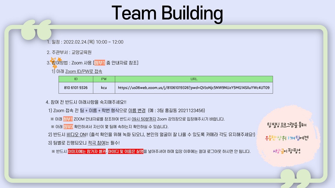 1) [첨부3] 확인하시어 본인에게 해당되는 팀을 확인해주세요.(첨부3 파일열고 팀확인 하세요!) 2) 팀빌딩 프로그램이 어떻게 진행되는지 궁금한 학생은 링크 참조해주세요. (https://youtu.be/jlwt6zlMcJ0) 3) 프로그램 참여 시 아래 내용 반드시 유의해주세요!!!! - 원활한 출석체크 및 결과분석을 위해 반드시 사전준비 후 Zoom에 접속하셔야 합니다. - Zoom 접속 전 팀번호+이름+학번 형식으로 이름변경해주세요. (예시 : 3팀 홍길동 2021321015) - Zoom에서는 반드시 비디오 ON!! and 팀별로 진행되오니 적극 참여는 필수!! - 참여시간과 나간시간이 자동기록되므로 성실하게 참여하기!! ID: 810 6101 9326 암호: kcu 링크: https://us06web.zoom.us/j/81061019326?pwd=QVJoNjc5NW9NUzY5MG14SlluYWc4UT09