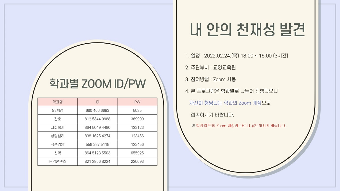 내안의 천재성 발견 학과별 줌링크 1. G2빅데이터경영학과 https://us06web.zoom.us/j/회의 ID: 680 466 6693 암호: 5025 2. 간호학과 https://us06web.zoom.us/j/ 회의 ID: 812 5344 9988 암호: 369999 3. 사회복지학과 https://us02web.zoom.us/j/ 회의 ID: 864 5049 4480 암호: 123123 4. 상담심리학과 https://us02web.zoom.us/j/ 회의 ID: 838 1625 4274 암호: 123456 5. 식품영양학과 https://us02web.zoom.us/j/ 회의 ID: 558 387 5118 암호: 123456 6. 신학과 https://us02web.zoom.us/j/ 회의 ID: 864 5123 5503 암호: 655925 7. 음악콘텐츠학과 https://us02web.zoom.us/j/ 회의 ID: 821 2856 8224 암호: 220693 ※ 전면 비대면으로 진행되기 때문에 참여방법이 다소 어렵게 느껴질 수 있습니다. 문의사항은 언제든지 교양교육원(02-2600-2266)으로 전화주세요.