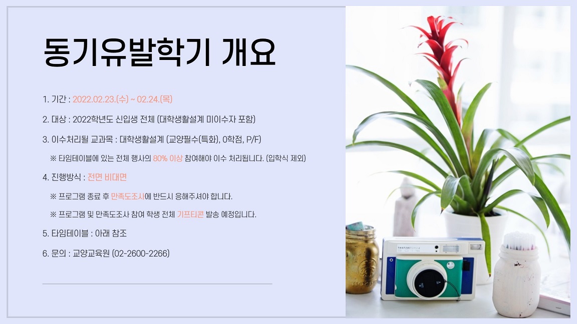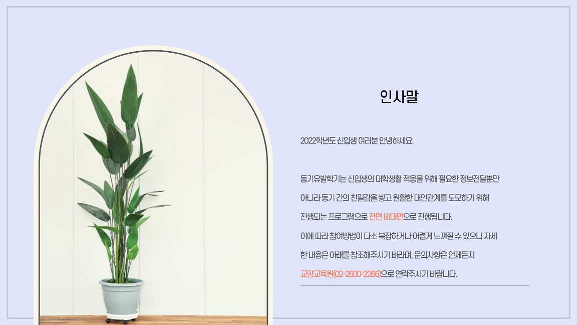 | 제목 | [교양교육원] 2022학년도 동기유발학기(대학생활설계) 안내 (2.23수정) | ||