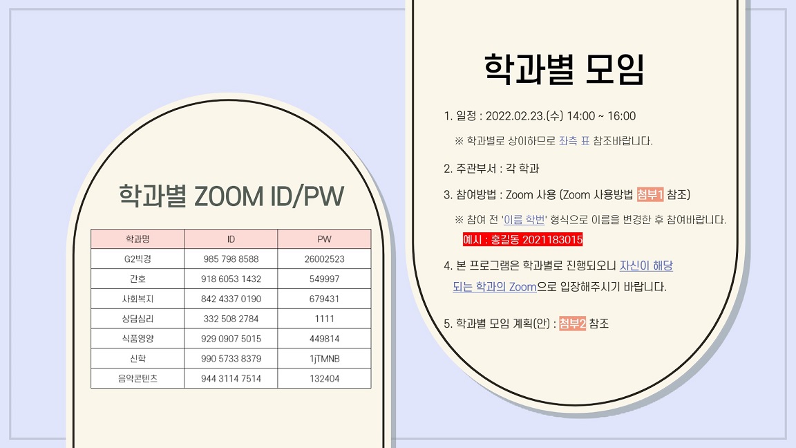 1) 학과별 모임은 각 학과에 따라 ID/PW가 다르니 위의 공지 확인하시기 바랍니다. 2) Zoom 접속 전 이름을 변경해주시기 바랍니다. (예시 : 홍길동 2021321015) 3) 학과별 모임 Zoom ID / PW / URL 링크 회의 ID: 985 798 8588 / 암호: 26002523 링크: https://kcu-ac-kr.zoom.us/j/9857988588 - 간호학과 회의 ID : 918 6053 1432 / 암호 : 549997 링크 : https://kcu-ac-kr.zoom.us/j/91860531432?pwd=Q3NlaHdHRHE4aEMySFlIQ3dRZldodz09 - 사회복지학과 회의 ID: 842 4337 0190 / 암호: 679431 링크: https://us06web.zoom.us/j/84243370190?pwd=eko0Q1ZMRXBwMkY4ZVF3d1VveWY4dz09 - 상담심리학과 회의 ID: 332 508 2784 / 암호: 1111 링크 : https://kcu-ac-kr.zoom.us/j/3325082784?pwd=RXFGakxRR3B1U09mR1c1VlU2eHRvZz09 - 식품영양학과 회의 ID: 929 0907 5015 / 암호: 449814 링크: https://kcu-ac-kr.zoom.us/j/92909075015?pwd=KzlDYUVYOVM2VlVyZkI2OXdVK1VGQT09 - 신학과 회의 ID: 990 5733 8379 / 암호: 1jTMNB 링크: https://zoom.us/j/99057338379?pwd=UzdnejkvUHNsTDVmd1pvOHRRcTUzdz09 - 음악콘텐츠학과 회의 ID: 944 3114 7514 / 암호: 132404 링크: https://kcu-ac-kr.zoom.us/j/94431147514?pwd=ZTlYWE1rQVJjOWs0MTNwcEY3TDFsdz09