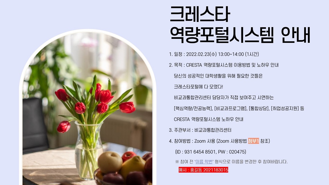 1) Zoom 접속 전 이름을 변경해주시기 바랍니다. (예시 : 홍길동 2021321015) 2) 크레스타역량포털시스템 안내 Zoom ID / PW / URL 링크 회의 ID: 931 6454 8501 / 암호: 020475 링크: https://kcu-ac-kr.zoom.us/j/93164548501?pwd=d2tlQW5RVW9SR0VSVlR6eVVrekM2UT09
