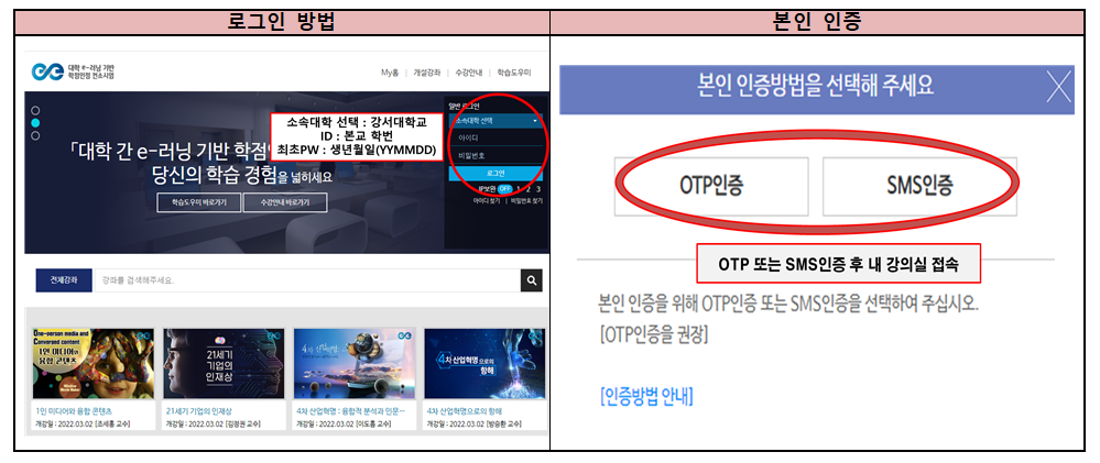 2022학년도 여름계절학기 온라인 학점교류 컨소시엄 수강 안내 온라인 학점교류 컨소시엄 수강 관련 내용을 아래와 같이 안내하오니, 수강신청할 학생께서는 수업진행에 참고하시기 바랍니다. 1) 접속방법 * 접속 가능 시점은 6월 13(월) 예정 가) 온라인 강좌 주소 : selc.or.kr 나) [소속대학 입력] 클릭하여 [강서대학교] 선택 후, ID 및 PW 입력 (ID 학번 / PW : 생년월일 (ex:970101)) 다) 본인인증(인증서 및 SMS) 후 접속 라) [내 강의실 바로가기] 하고 과목 확인 및 수업 시청