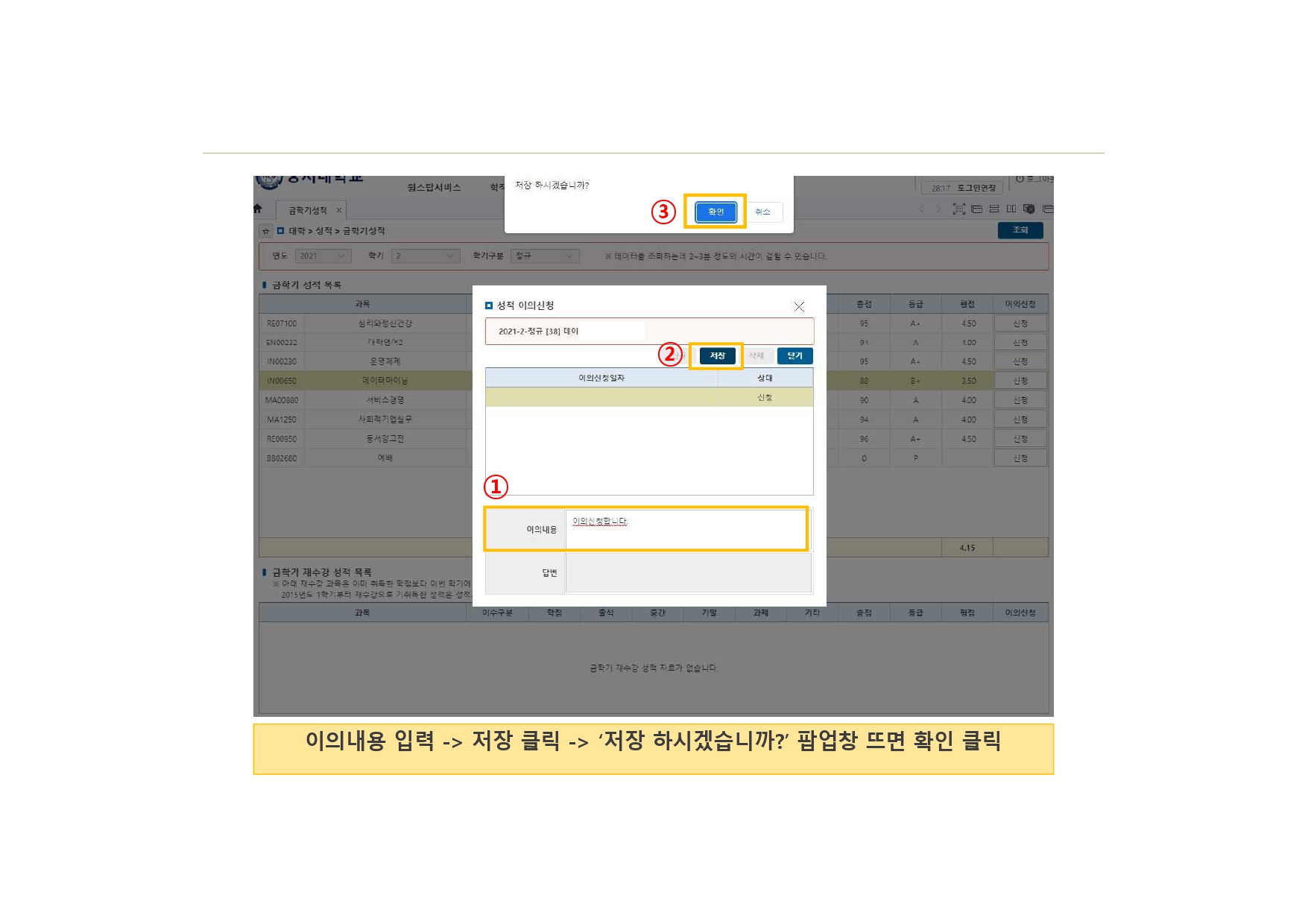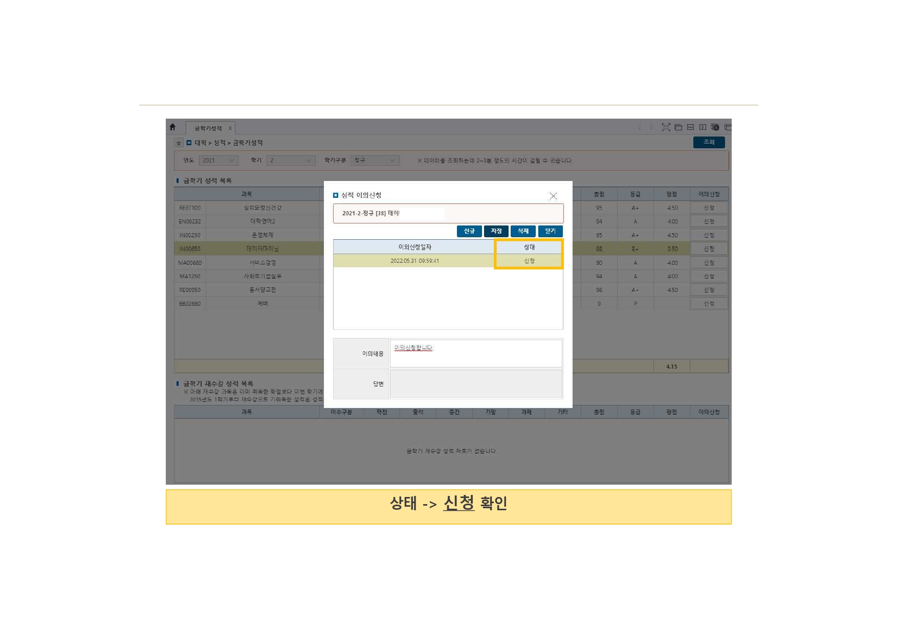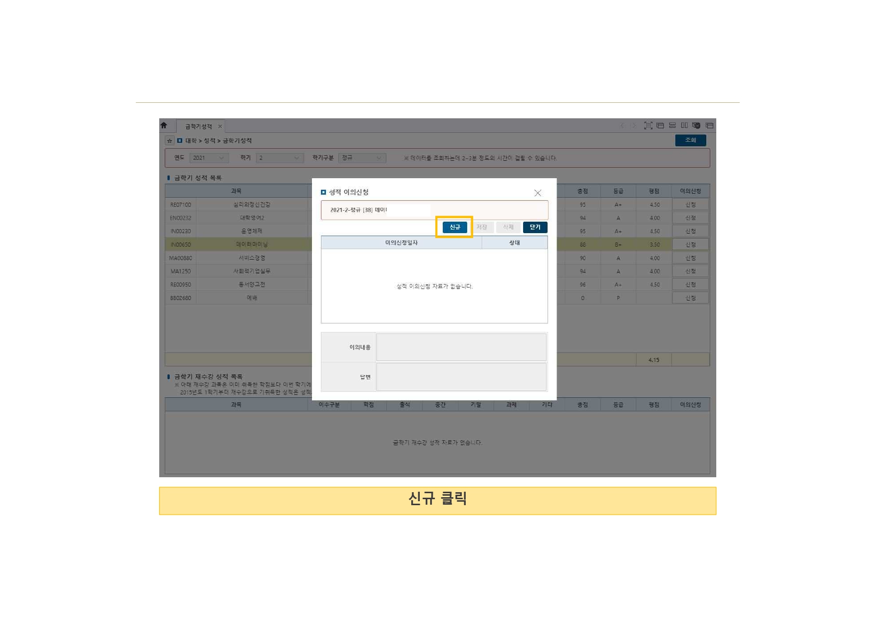 ![]() ![]() ![]() ![]() ![]() 1. 학사인트라넷 로그인 2. 성적 > 금학기성적클릭 > 연도, 학기, 학기구분 선택 > 조회 3. 이의신청할 과목 선택 > 이의신청 클릭 4. "신규"클릭 5. 이의내용 입력 > 저장 클릭 > 저장 하시겠습니까? 팝업창 뜨면 확인 클릭 6. 상태 " 신청 " 확인