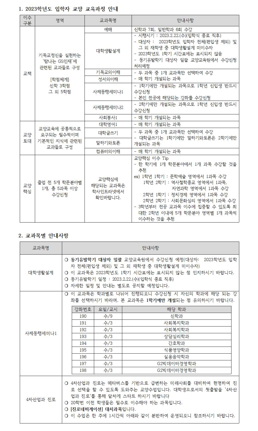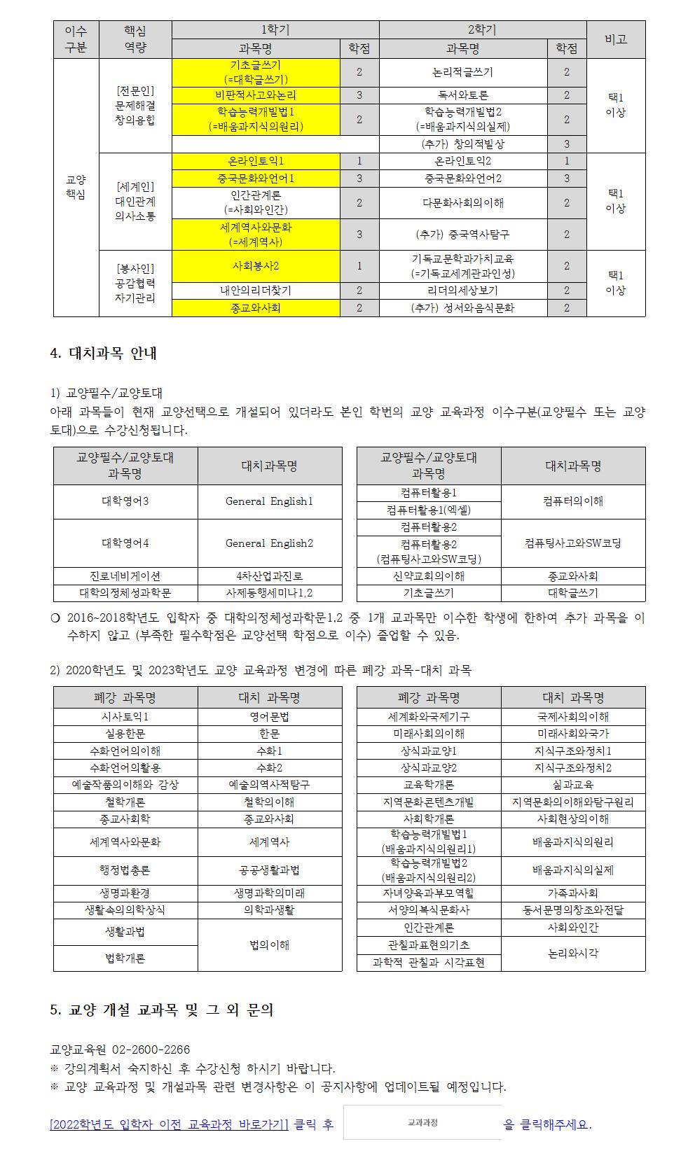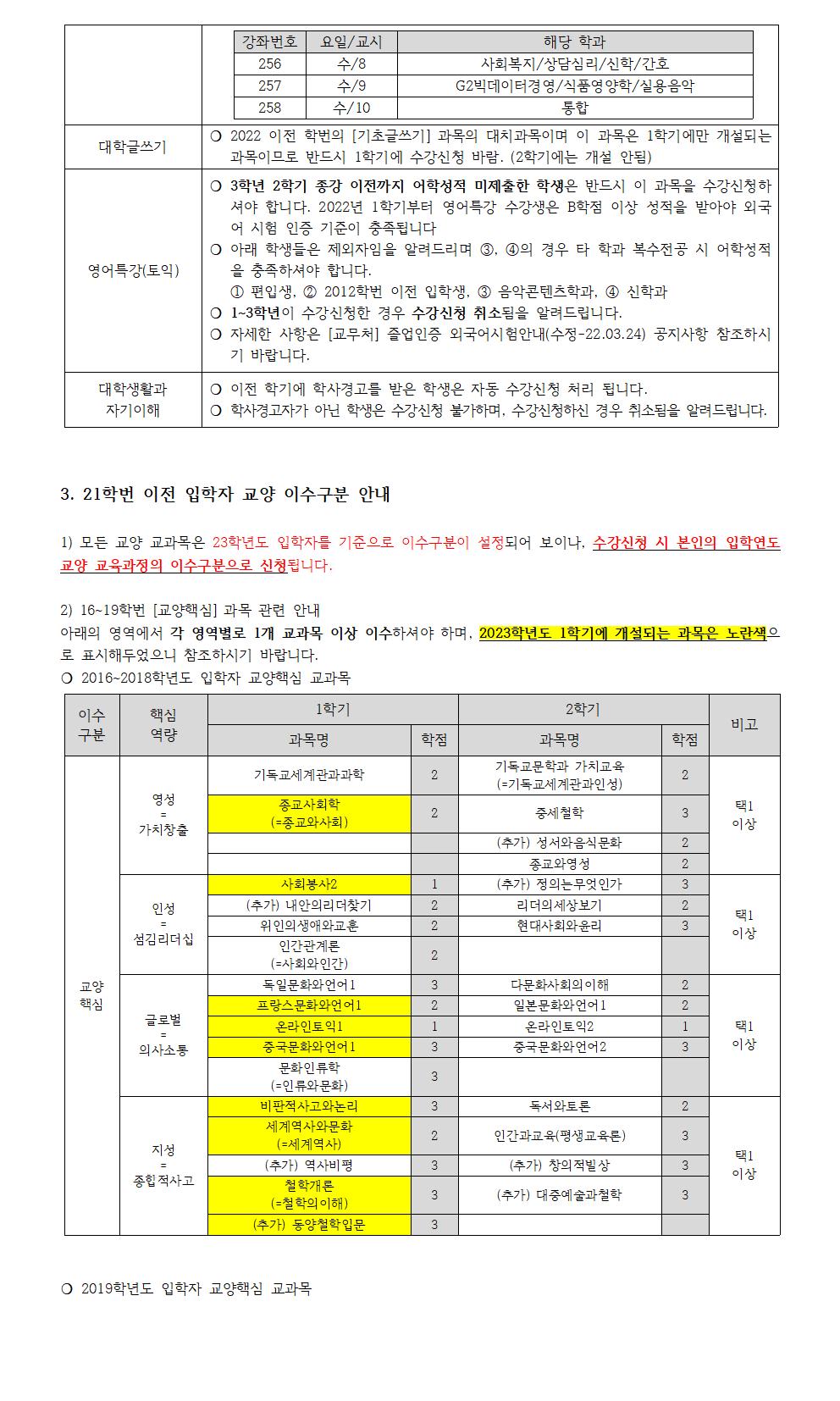 02.28. [사회봉사1(김종희 교수)] 수6교시, 본관304호 분반 1개 추가 개설 [사제동행세미나1(196실용음악)(수3교시)] 최연희->최성락 담당교수 변경 03.10. [대학글쓰기(최석화 교수)] 금1-2교시, 금4-5교시 2개반 본208->본403 강의실 변경 1. 2023학년도 입학자 교양 교육과정 안내
