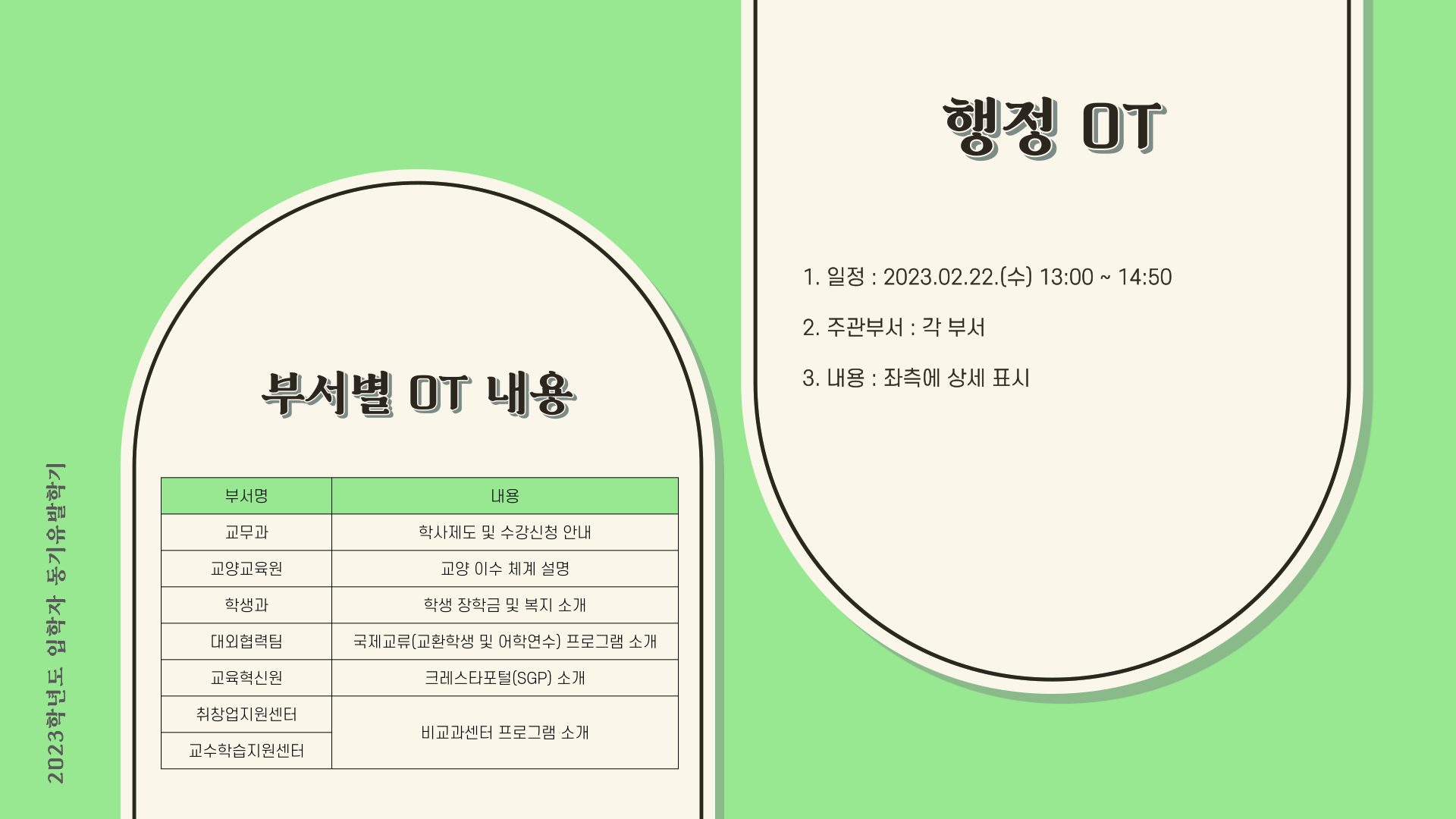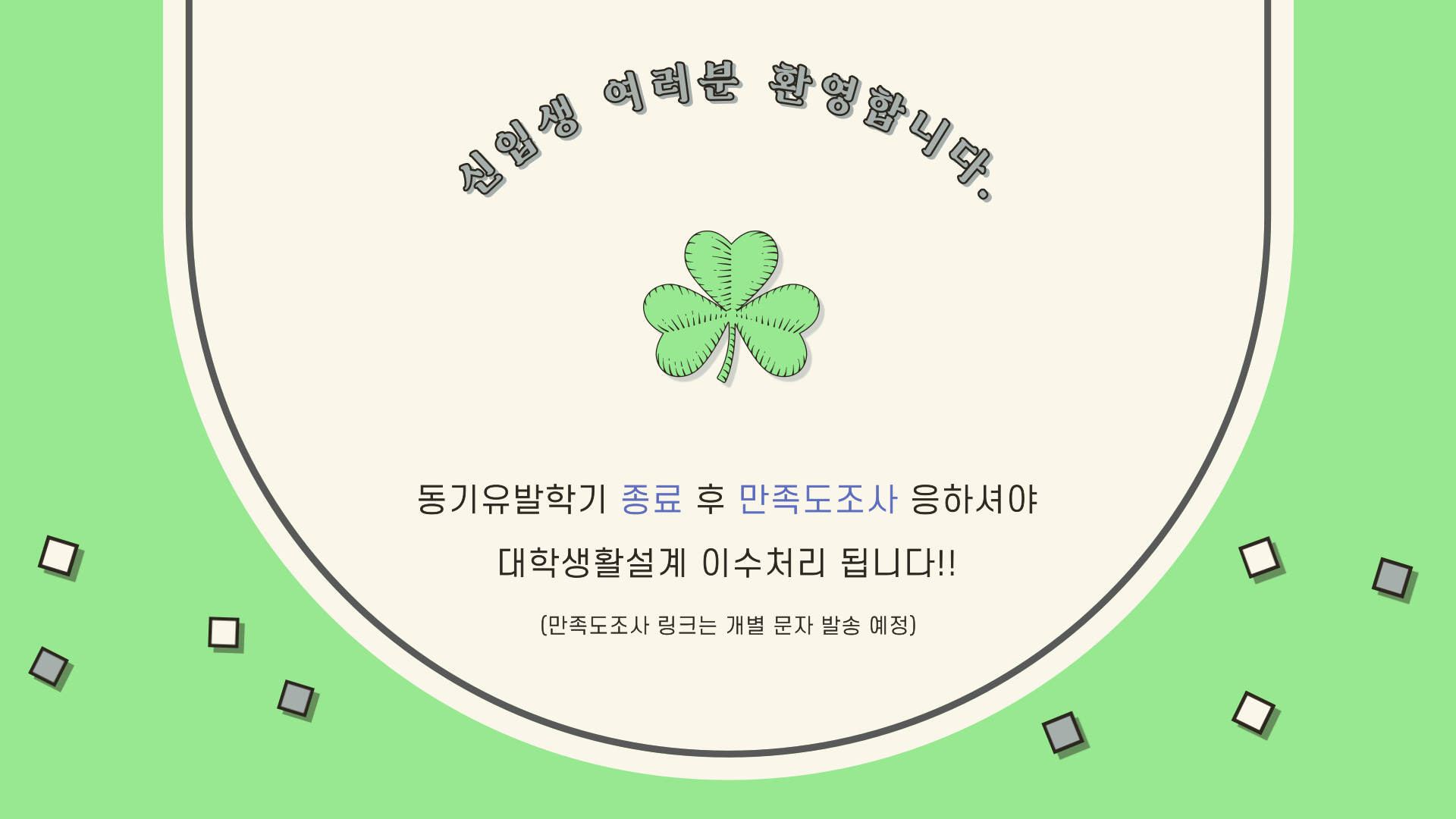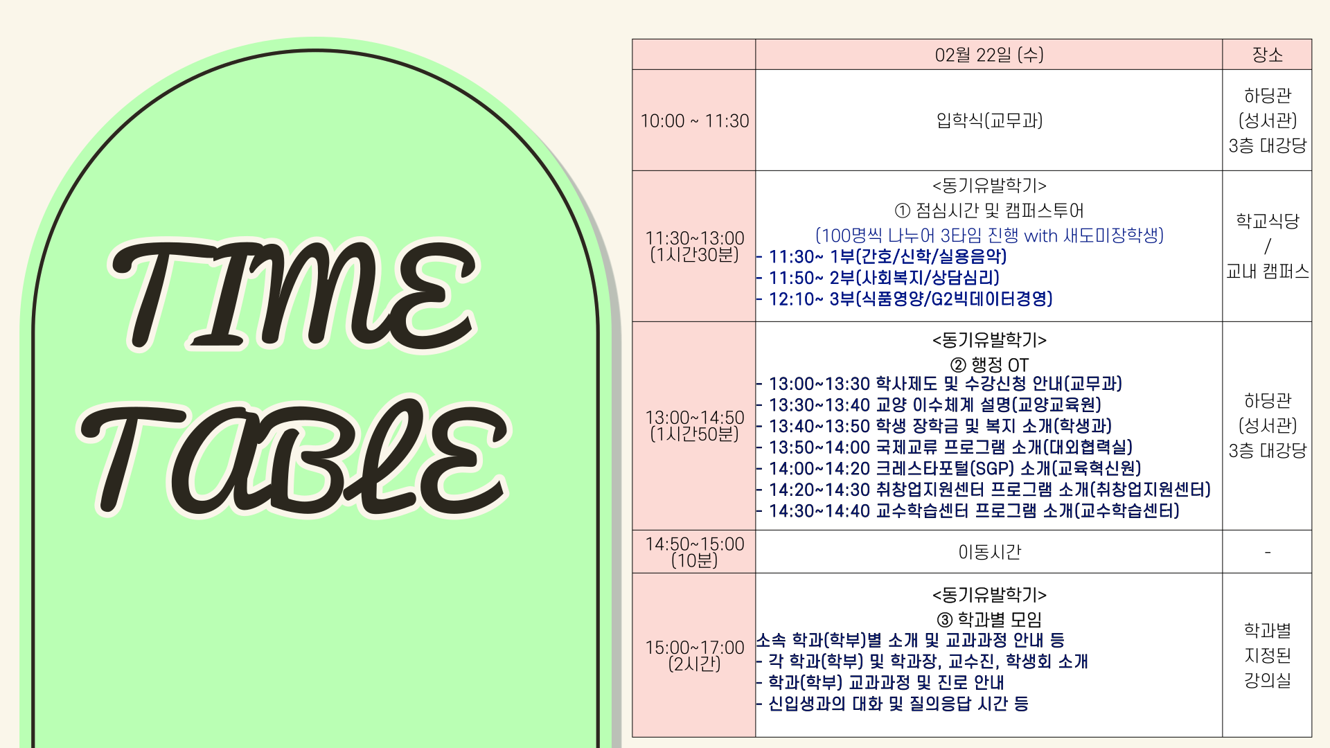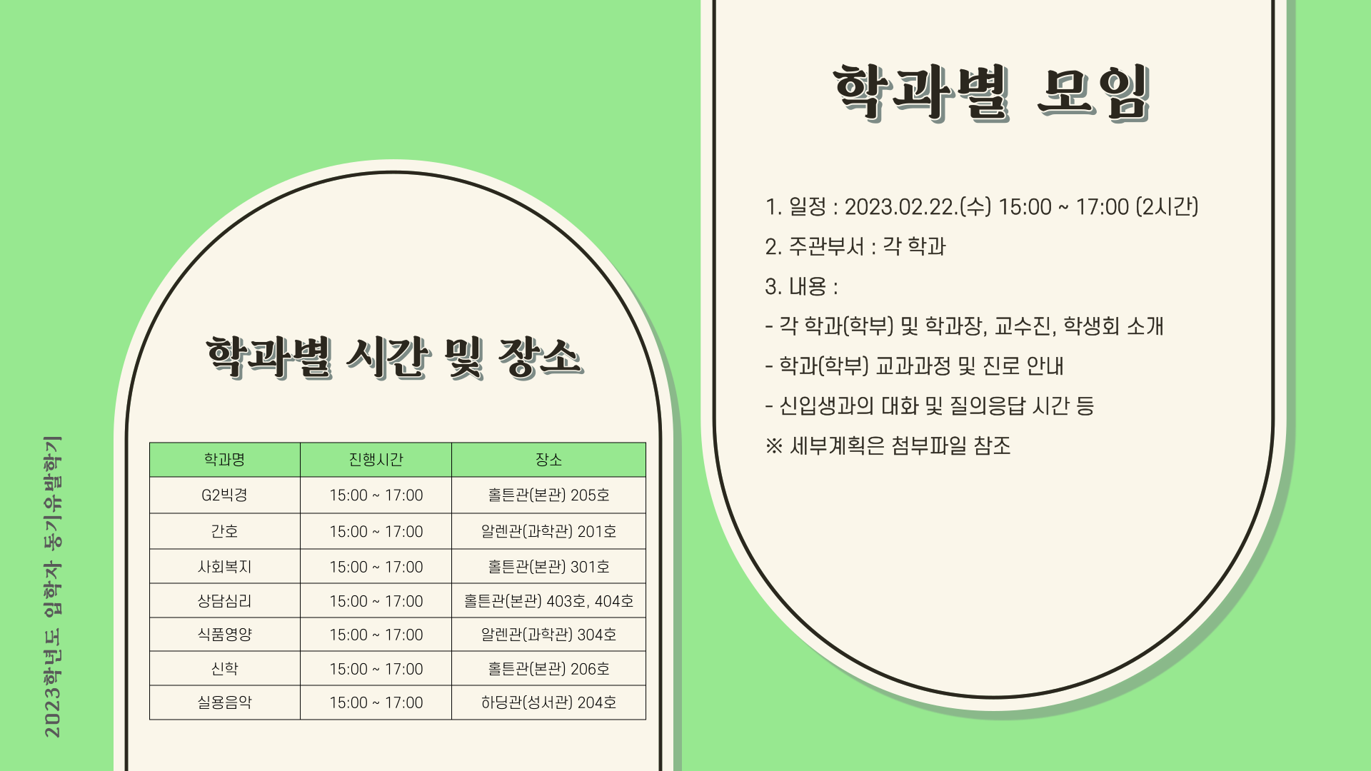 2023 동기유발학기 HELLO. 2023. 동기유발학기 참여 안내(교과목명 : 대학생활설계) 인사말 2023학년도 신입생 여러분 안녕하세요. 동기유발학기는 신입생의 대학생활 적응을 위해 필요한 정보전달뿐만 아니라 동기 간의 친밀감을 쌓고 원활한 대인관계를 도모하기 위해 진행되는 프로그램으로 전면 대면으로 진행됩니다. 자세한 내용은 아래를 참조해주시기 바라며, 문의사항은 언제든지 교양교육원(02-2600-2266)으로 연락주시기 바랍니다. 동기유발학기 개요 1. 일시 : 2023.02.22.(수) 입학식 직후 ~ 오후5시까지 2. 장소 : 하딩관(성서관) 3층 대강당 및 각 학과별 지정장소 3. 대상 : 2023학년도 신입생 전체 및 대학생활설계 미이수 재학생 ※ 모든 프로그램의 출석 처리가 되어야 이수 처리됩니다. (입학식 제외) ※ '대학생활설계'과목의 수청신청은 교양교육원에서 일괄신청 (개인 수강 신청 안됨) 4. 이수처리될 교과목 : 대학생활설계 (교양필수(교책), 0학점, P/F) 5. 타임테이블 : 아래 참조 6. 문의 : 교양교육원 (02-2600-2266) ※ 프로그램 종료 후 문자로 전송되는 만족도조사에 반드시 응해주셔야 합니다. 타임테이블 02월 22일 (수) 시간 : 10:00 ~ 11:30 내용 : 입학식(교무과) 장소 : 하딩관(성서관) 3층 대강당 시간 : 11:30~13:00 (1시간30분) 내용 : <동기유발학기> ① 점심시간 및 캠퍼스투어 (100명씩 나누어 3타임 진행 with 새도미장학생)- 11:30~ 1부(간호/신학/실용음악) - 11:50~ 2부(사회복지/상담심리) - 12:10~ 3부(식품영양/G2빅데이터경영) 장소 : 학교식당/교내 캠퍼스 시간 : 13:00~14:50(1시간50분) 내용 : <동기유발학기> ② 행정 OT- 13:00~13:30 학사제도 및 수강신청 안내(교무과) - 13:30~13:40 교양 이수체계 설명(교양교육원) - 13:40~13:50 학생 장학금 및 복지 소개(학생과) - 13:50~14:00 국제교류 프로그램 소개(대외협력실) - 14:00~14:20 크레스타포털(SGP) 소개(교육혁신원) - 14:20~14:30 취창업지원센터 프로그램 소개(취창업지원센터) - 14:30~14:40 교수학습센터 프로그램 소개(교수학습센터) 장소 : 하딩관(성서관) 3층 대강당 시간 : 14:50~15:00 (10분) 내용 : 이동시간 시간 : 15:00~17:00(2시간) 내용 : <동기유발학기> ③ 학과별 모임소속 학과(학부)별 소개 및 교과과정 안내 등 - 각 학과(학부) 및 학과장, 교수진, 학생회 소개 - 학과(학부) 교과과정 및 진로 안내 - 신입생과의 대화 및 질의응답 시간 등 장소 : 학과별 지정된 강의실 캠퍼스맵 학과별 좌석배치표 점심시간 안내 1부(간호/신학/실용음악) 11시 30분부터 11시 50분까지 2부(사회복지/상담심리) 11시 50분부터 12시 10분까지 3부(식품영양/G2빅경) 12시10분부터 12시 30분까지 행정 OT 일정 : 2023.02.22.(수) 13:00 ~ 14:50 부서별 OT내용 교무과 : 학사제도 및 수강신청 안내 교양교육원 : 교양 이수 체계 설명 학생과 : 학생 장학금 및 복지 소개 대외협력팀 : 국제교류(교환학생 및 어학연수) 프로그램 소개 교육혁신원 : 크레스타포털(SGP) 소개 취창업지원센터/교수학습지원센터 : 비교과센터 프로그램 소개 학과별 시간 및 장소 일정 : 2023.02.22.(수) 15:00 ~ 17:00 내용 : - 각 학과(학부) 및 학과장, 교수진, 학생회 소개 - 학과(학부) 교과과정 및 진로 안내 - 신입생과의 대화 및 질의응답 시간 등 G2빅경 : 홀튼관(본관) 205호 간호 : 알렌관(과학관) 201호 사회복지 : 홀튼관(본관) 301호 상담심리 : 홀튼관(본관) 403호, 404호 식품영양 : 알렌관(과학관) 304호 신학 : 홀튼관(본관) 206호 실용음악 : 홀튼관(본관) 207호 신입생 여러분 환영합니다. 동기유발학기 종료 후 만족도조사 응하셔야 대학생활설계 이수처리 됩니다!! (만족도조사 링크는 개별 문자 발송 예정)