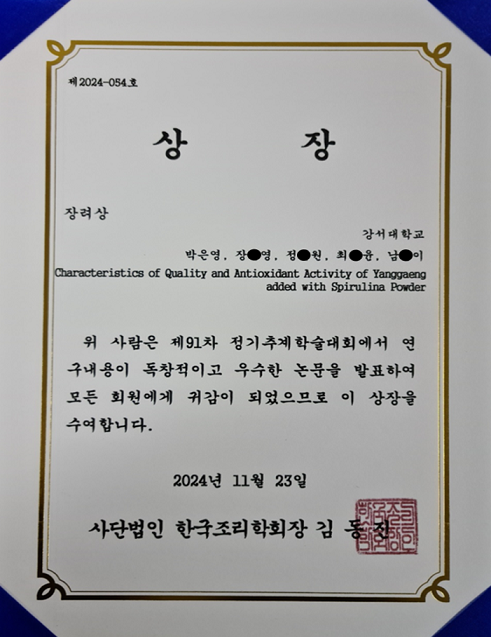 ![]() 식품영양학과 박은영 교수와 장*영·최*윤·정*원·남*이 학생이 11월 23일 개최된 제91차 한국조리학회 정기추계학술대회에서 “Characteristics of Quality and Antioxidant Activity of Yanggaeng added with Spirulina Powder”라는 주제의 논문으로 연구의 독창성과 우수성을 인정받아 우수 논문 장려상을 수상하였다.