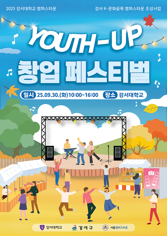 ![]() [강서대학교 캠퍼스타운] YOUTH-UP 창업 페스티벌 안내 안녕하세요. 강서대학교 캠퍼스타운사업단입니다. 강서대 캠퍼스타운 단위형 5기 사업(2023~2025)을 마무리하며, 입주기업 및 졸업기업, 강서대 재학생, 외국인 유학생 등이 함께하는 사업성과 확산 및 공유회를 개최합니다. ▷ 행사 개요 일시 : 2025년 9월 30일(화) 10:00 ~ 16:00 장소 : 강서대학교 캠퍼스 (홀튼관 앞 주차장 및 알렌관 지하) ▷ 주요 프로그램 1) 입주기업 및 졸업기업 홍보·체험 부스 운영 2) 대학 부스 운영 (취창업지원센터, 국제교육교류원 등) 3) 무대 프로그램 (개막식, 입주기업 및 학과 동아리 공연 등) 4) 포토부스 운영 5) 캠퍼스타운 본부 운영 (스탬프 투어) - 부스 체험 후 캠퍼스타운 본부 부스 방문 시, 기념품으로 교환해 드립니다. ▷ 문의처 강서대학교 캠퍼스타운사업단 02-2648-2295 / kc_campustown@gangseo.ac.kr 교직원 및 학생 여러분의 많은 관심과 참여 부탁드립니다. 감사합니다.