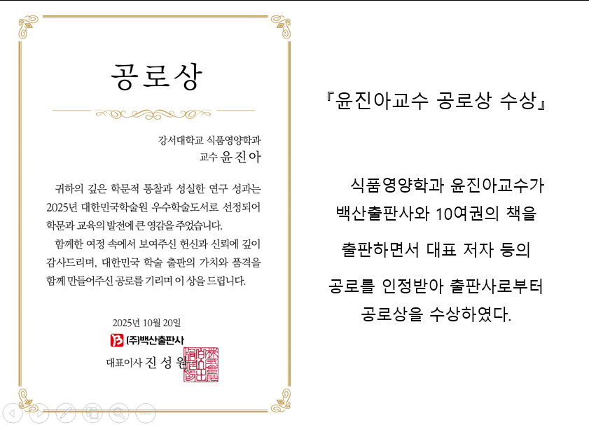 | 제목 | [식품영양학과] 윤진아 교수 백산출판사 공로상 수상 | ||