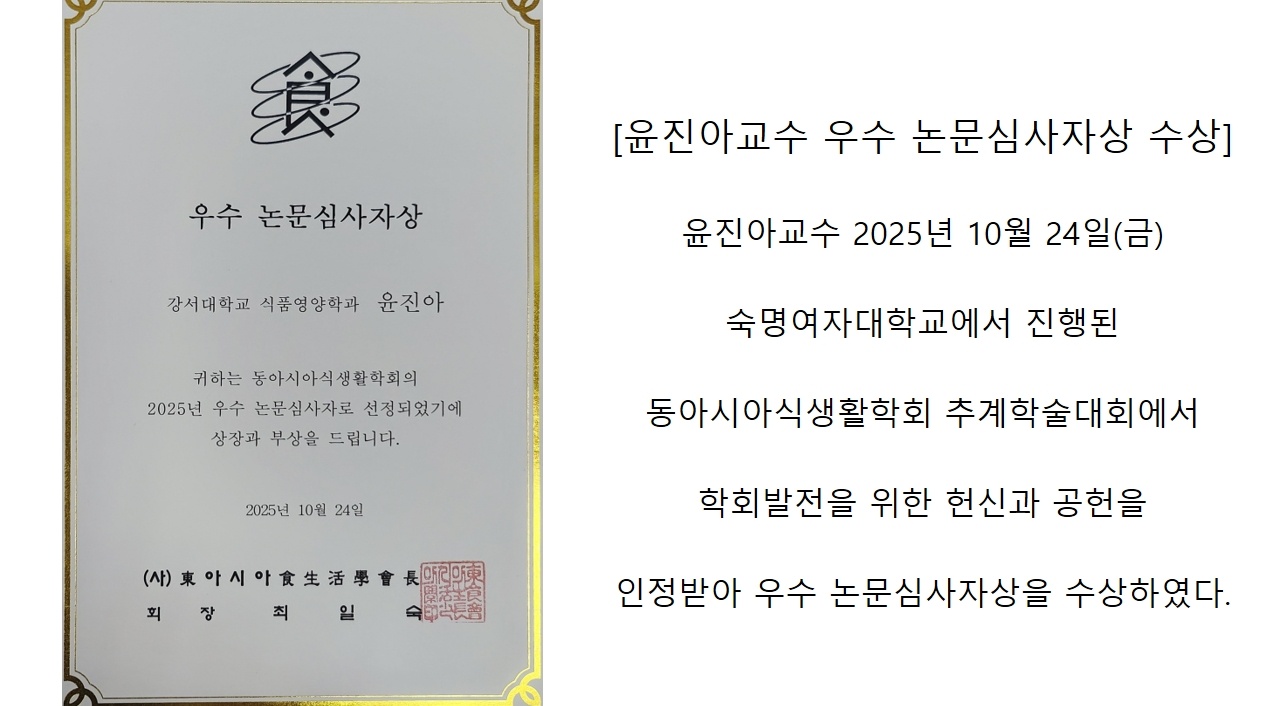 | 제목 | [식품영양학과] 윤진아 교수 논문심사자상 수상 | ||