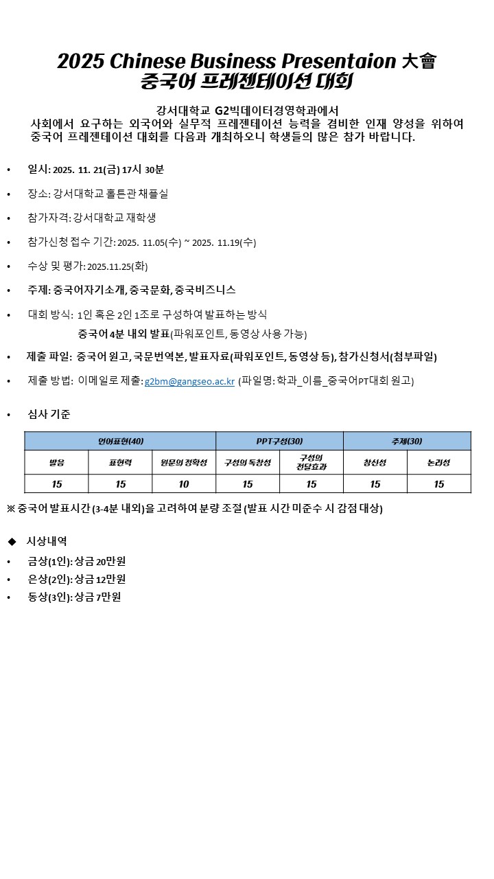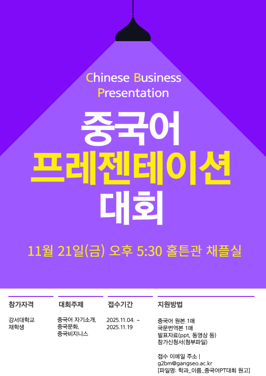 | 제목 | 2025-2학기 제12회 중국어 프레젠테이션 대회 참가신청 공지 | ||